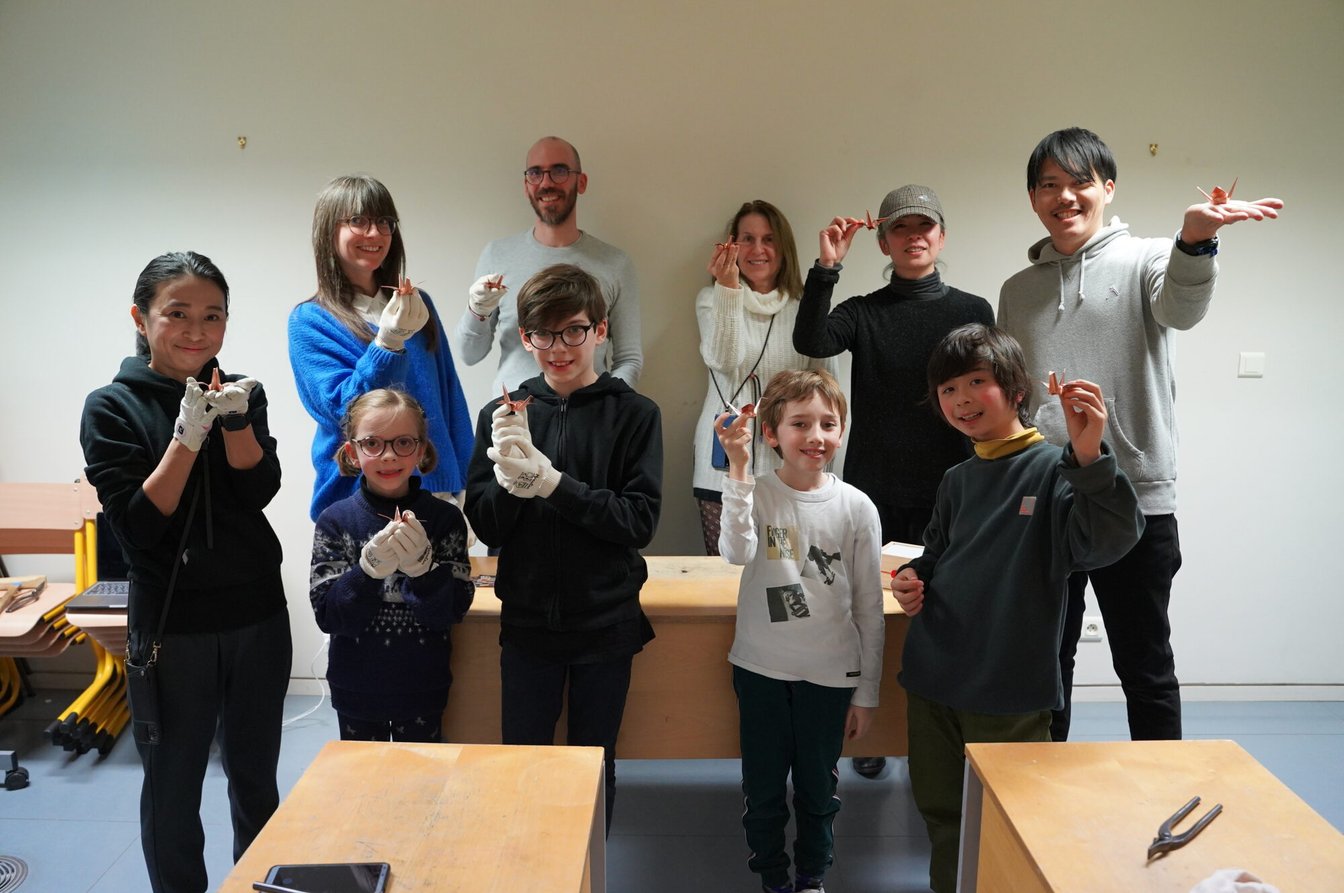 ワークショップは、折鶴について説明するところからはじまります。広島で被爆した少女が、回復を願って折り紙で鶴をつくったエピソードから、平和記念公園にはたくさんの折鶴が捧げられています。しかし、不審火で燃やされる事故があり、京都の板金屋さんが燃やされない鶴をつくるために銅板の折鶴が生まれたと言われています。今もヨーロッパの隣国であるウクライナで紛争が起こっている。遠い日本から、折鶴で平和を伝えたいと想いをお話ししました。