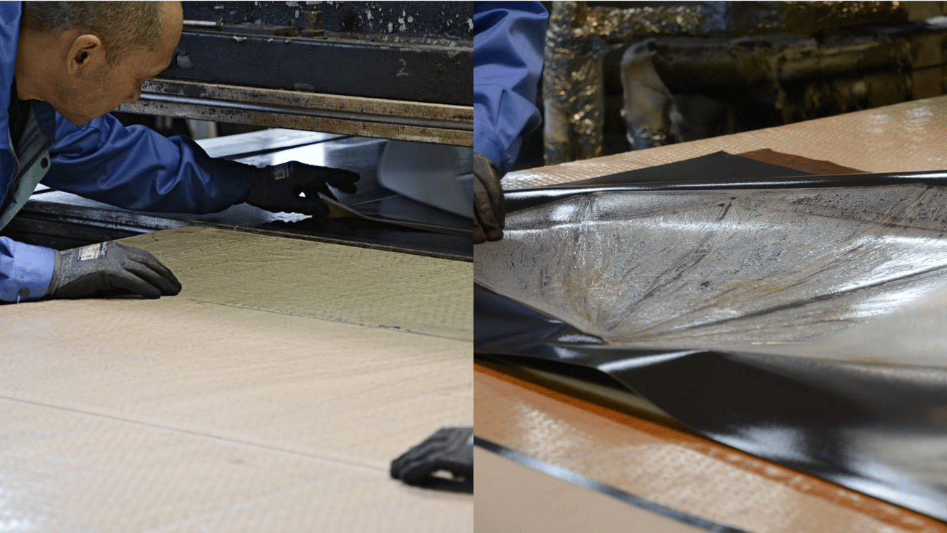 職人が温度と圧力を見極めながらプレス機で圧着し、PLASTICITYの主素材となる『GLASS RAIN』を作ります。