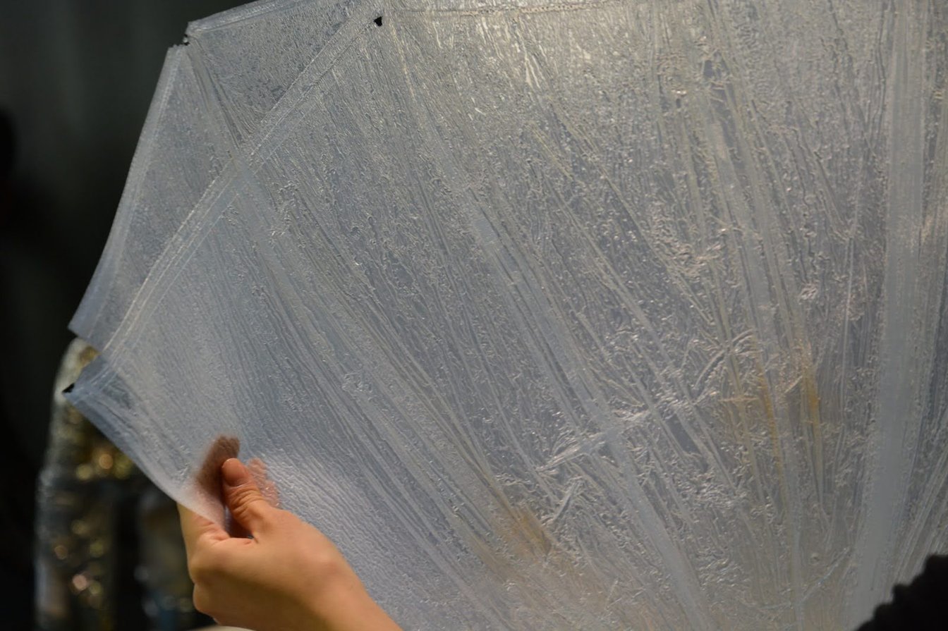 『GLASS RAIN』はとても丈夫で硬い素材です。ビニール傘そのままの特性を残しているので、防水性が高くメンテナンスしやすいという特徴があります。ビニール傘が使われていたときの使用感がそのまま素材に反映されるため、1枚1枚の表面の表情が異なります。雨の日の窓ガラスのような表情を見せることから『GLASS RAIN』と名付けられました。
