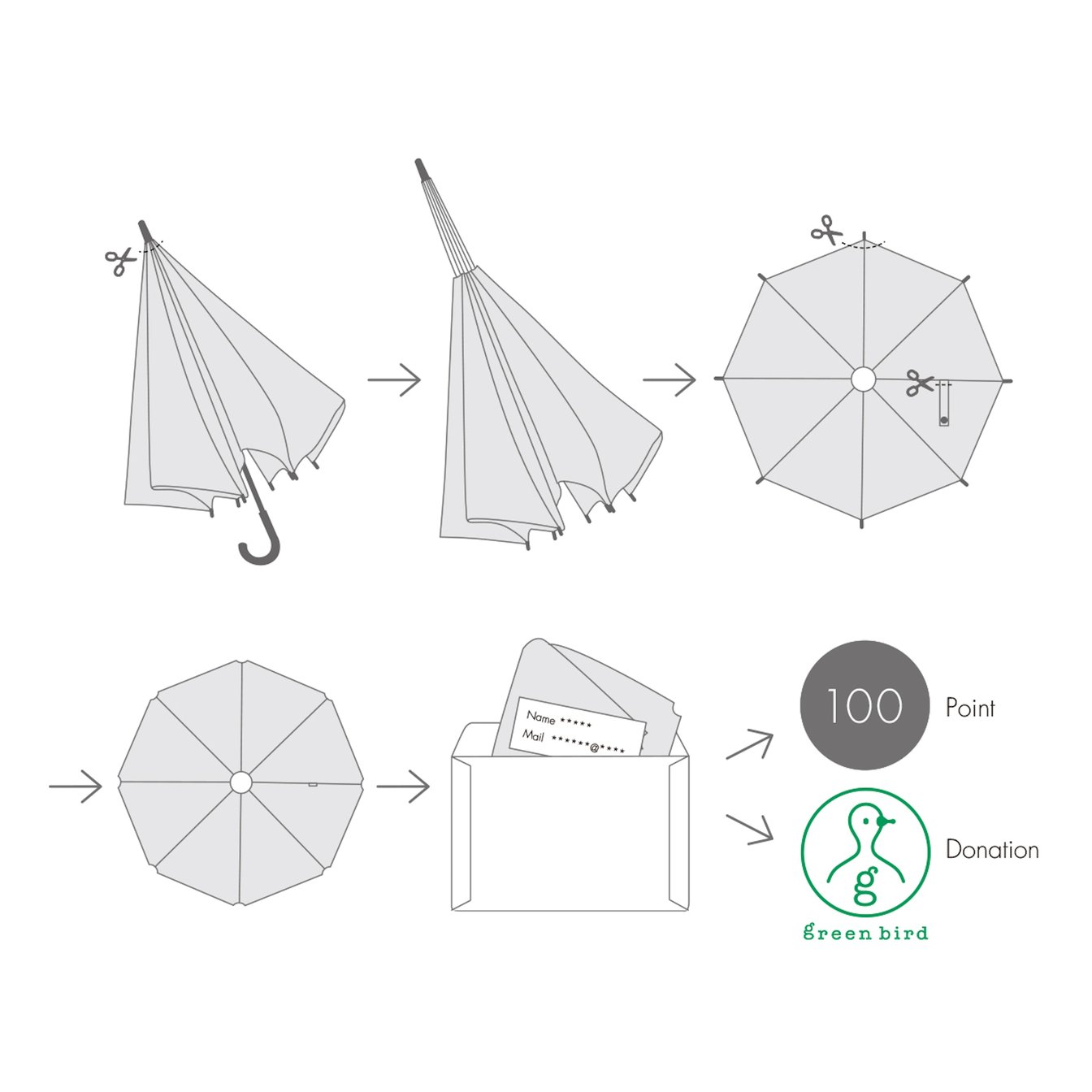 「お客様や各種団体などで使われなくなった捨てる前のビニール傘を回収しています。ご自身でビニール傘を解体していただき、ビニール素材のみをお送りいただきます。お送りいただいたビニール素材は弊社で買い取ります。オンラインストアで使えるポイント、または認定NPO法人への寄付金として還元しております」