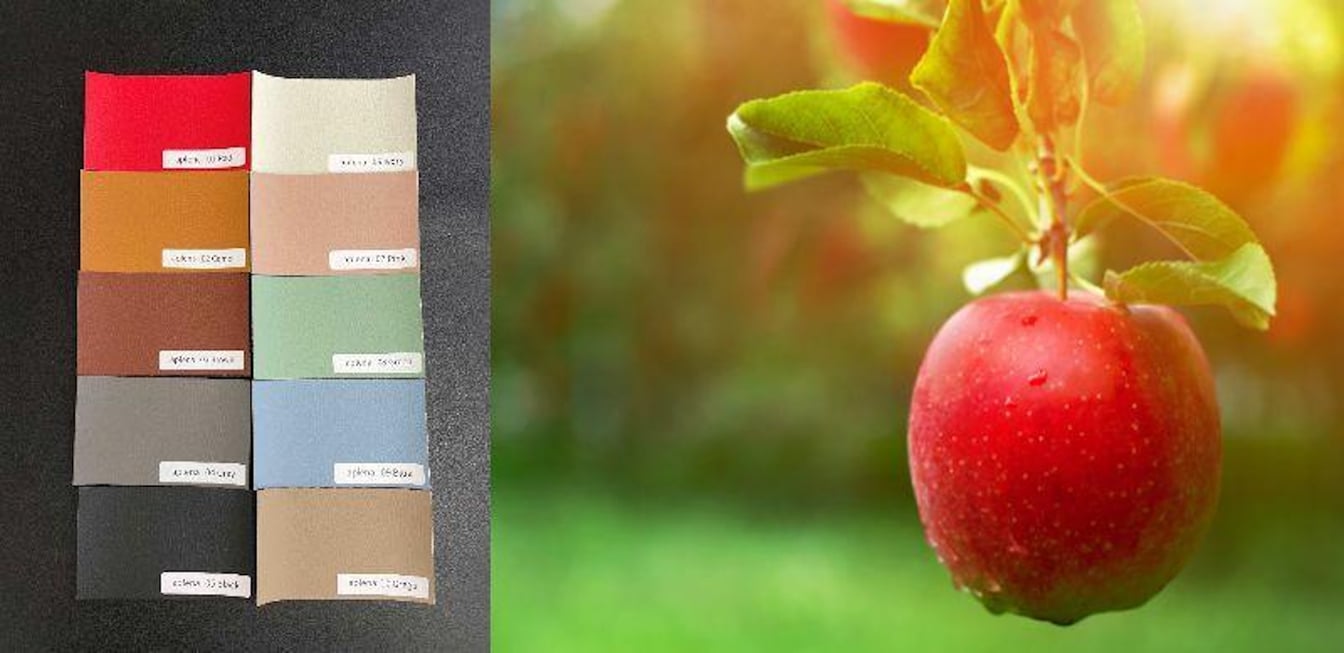 「aplena」は、青森県産のりんごジュースの搾りかすを加工し樹脂に配合したものを加工することによってヴィーガンレザーとなる。分類としては合成皮革にあたり、柔らかな感触と軽さが特徴だ。表地にシボ加工が施してある。
