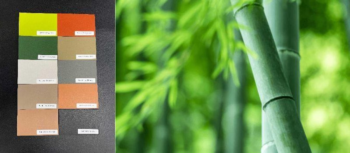 表:竹8%PU92%裏:ナイロン60%PU40%を配合。カラーは10色を揃える。バンブレナは共和ライフテクノ株式会社の商標