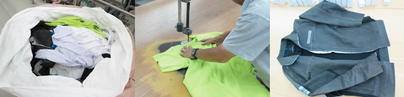 混紡素材は、専用の反毛機械を使ってもう一度綿(わた)状に戻し、糸やフェルトにして再利用し、ポリエステル素材は裁断された生地を分離・分解、乾燥・溶解したのちペレット化され、プラスチック成型品の原料となる。