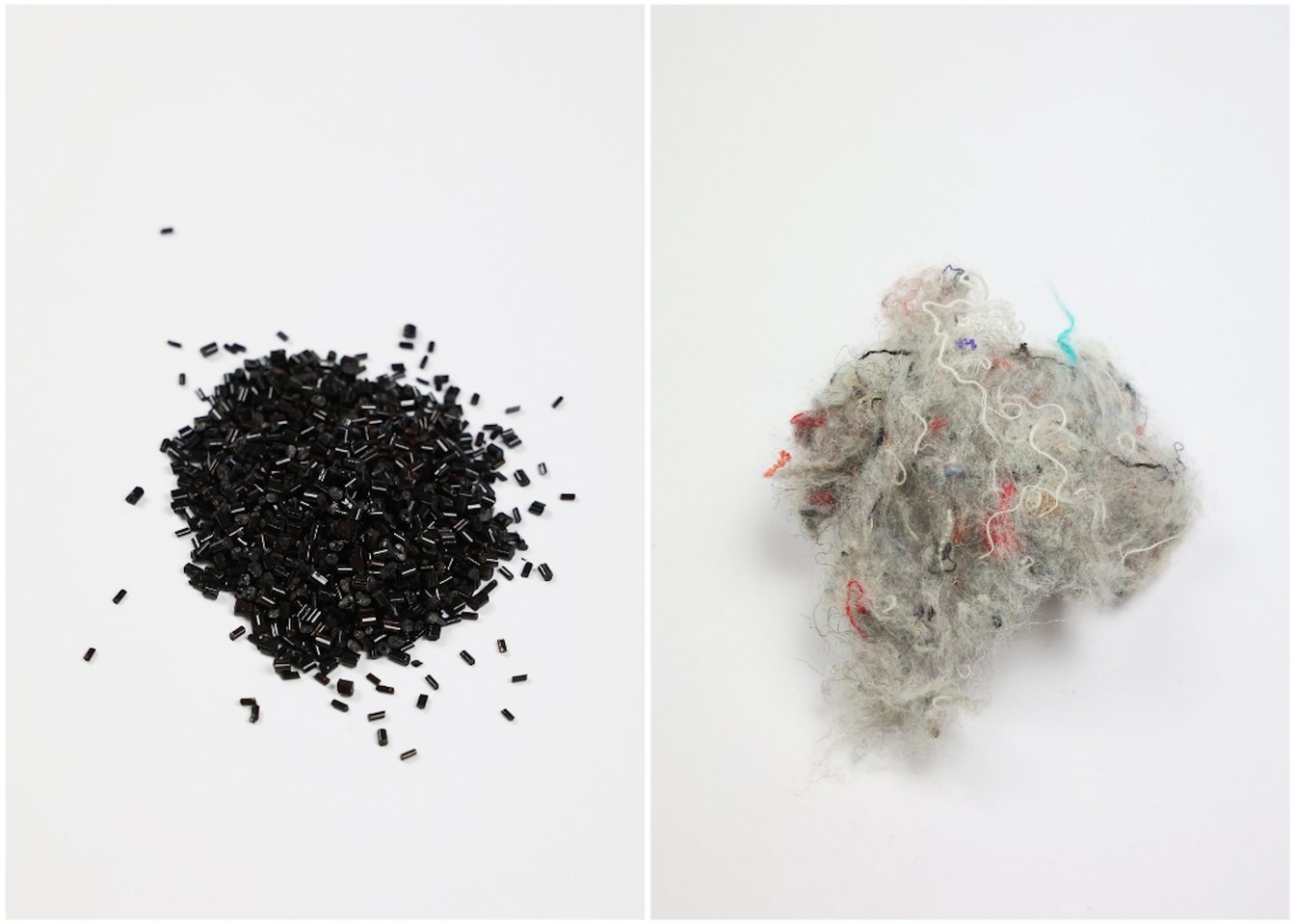 左)ポリエステル素材のペレット、(右)混紡素材の反毛