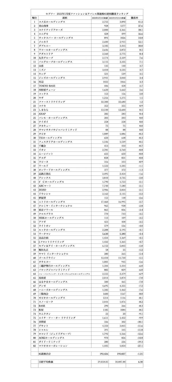 「セブツー」では毎月ファッション&アパレル関連企業82社(先月の83社中カッシーナ・イクスシーが上場廃止)の株価上昇率ランキングを紹介している。今月は5月(5月1日〜5月31日)の上昇率ランキングを発表する。