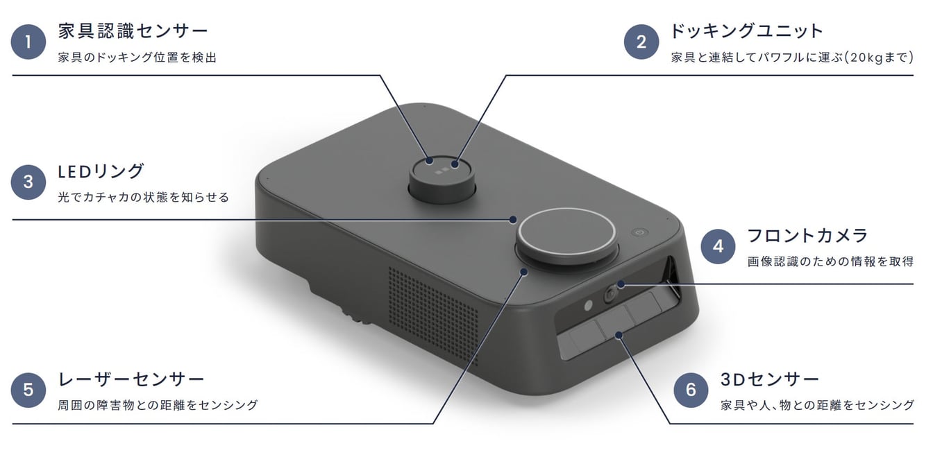 さらに、カチャカが専用家具の下に潜り込んでスムーズに連結・運搬できるよう、PFRoboticsは独自のドッキングユニットを開発。カチャカ1台で複数の専用家具を認識して移動させることができます。