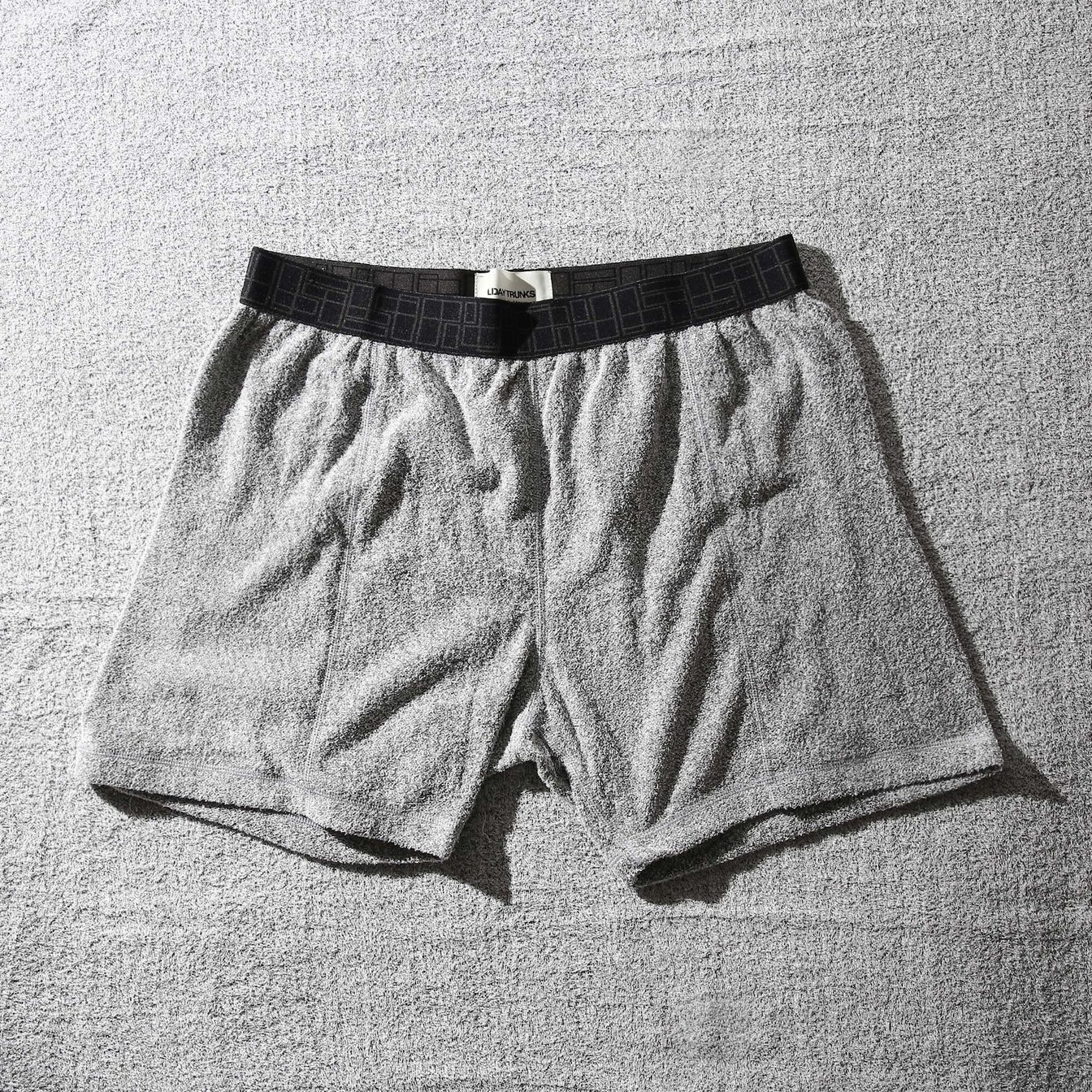 HOLIDAY TRUNKSが大切にしているワードとして「トランクスの再解釈」という言葉がある。特別な編み機で作られる良質なパイル生地はトランクスという概念を超えて、ルームウエアへと進化した。「家でパンツ1枚で過ごす」という行為を、リラックスだけでなくスタイリッシュなものに価値観ごと変えてしまったブランドだといえる。