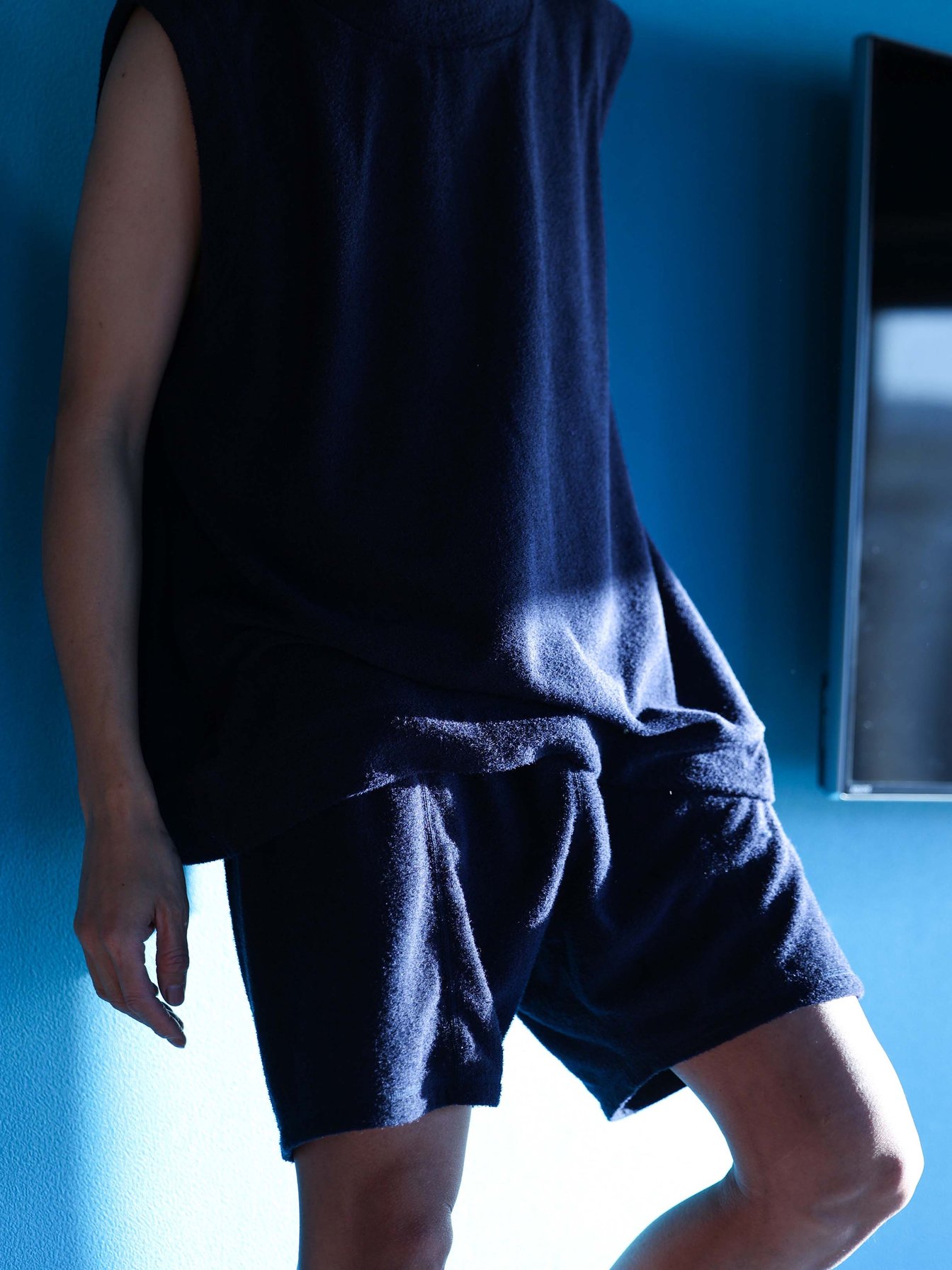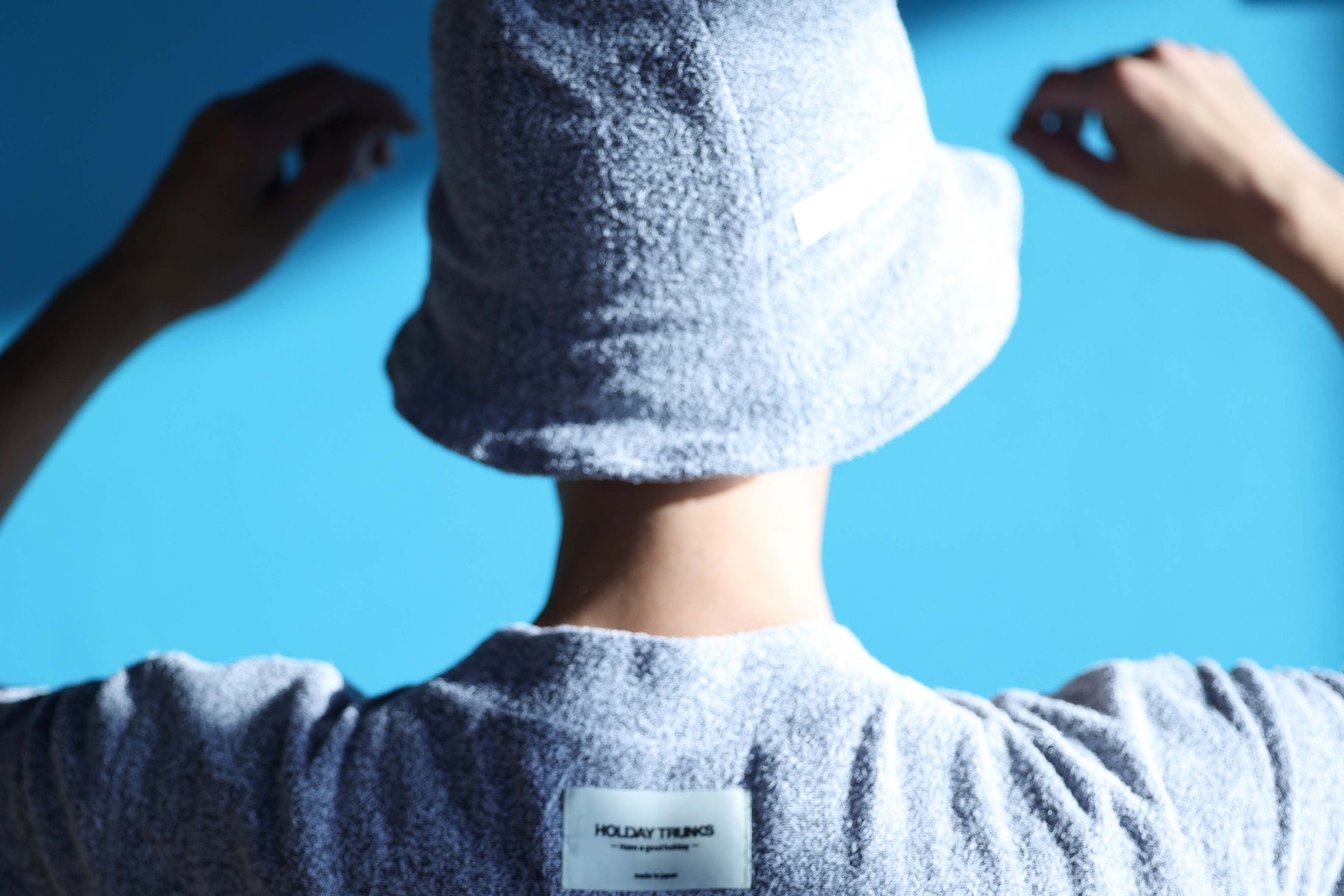 HOLIDAY TRUNKSの素材や基本ラインナップについて話を聞いてきたが、ここからはこの春にリリースされた人気アイテムを紹介してもらおう。「先程お話ししたリラックスするシーンの中には“サウナ”という要素もありまして、HOLIDAY TRUNKSでも『SAUNA HAT(サウナハット)』を発売したのですが、大変ご好評いただいています。他のアイテムと同様のパイル生地でシンプルなデザインに仕上げ、ロッカーの鍵が入るポケットが付いた仕様になっています。箕輪厚介さんプロデュースの『サウナランド』というイベントに出させていただいてからサウナイベントへの出展の依頼がくるようになったことが経緯で作ったアイテムなのですが、トランクス同様、単純に私がサウナ好きというのがこのアイテムを作った1番のきっかけです。さらにサウナだけではなく、熊本の天草にある『L'isola THE BIRD(リゾラザバード)』というコテージやサウナがある宿泊施設でも、ルームウェアとしてHOLIDAY TRUNKSが採用されています」