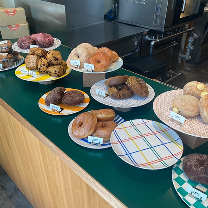 お店に入ってすぐに目に入る、カラフルなお皿に乗ったたくさんのドーナツにキュンときますね。