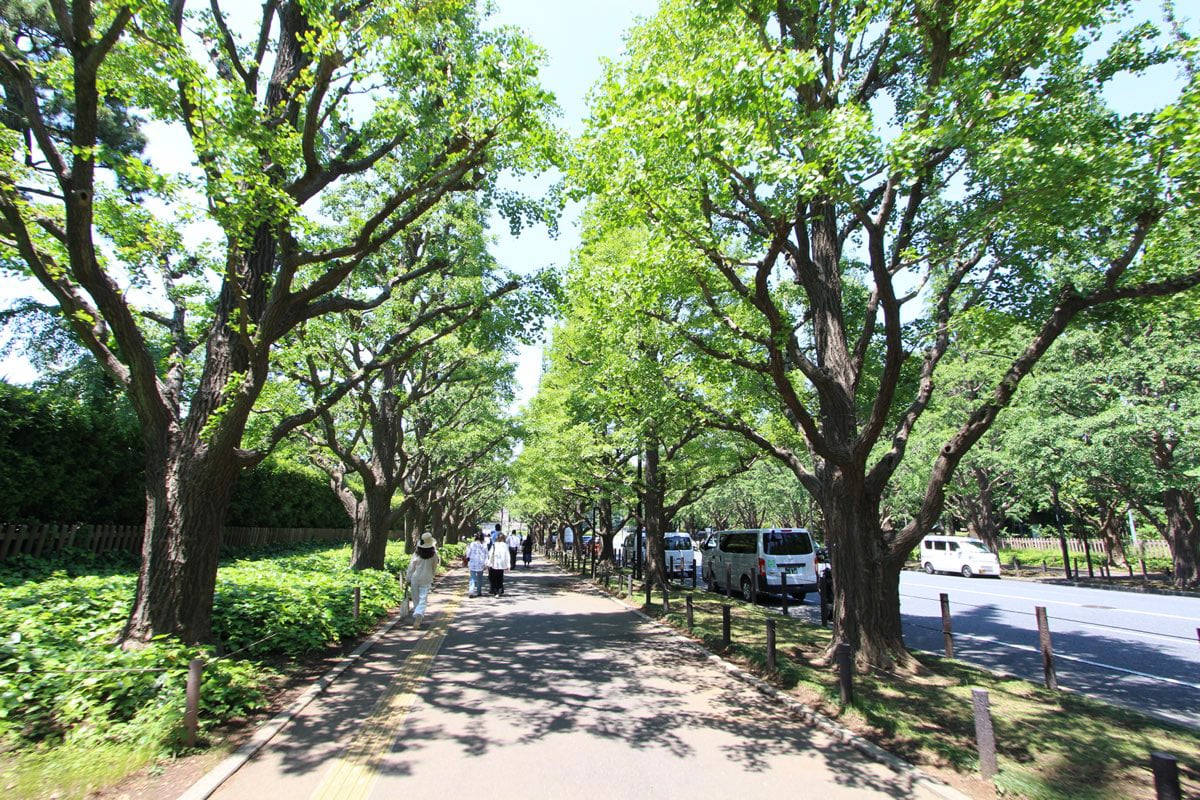 オモハラエリア有数のフォトスポットとして知られる外苑の銀杏並木には、遠近法を用いたちょっとした仕掛けがある。
