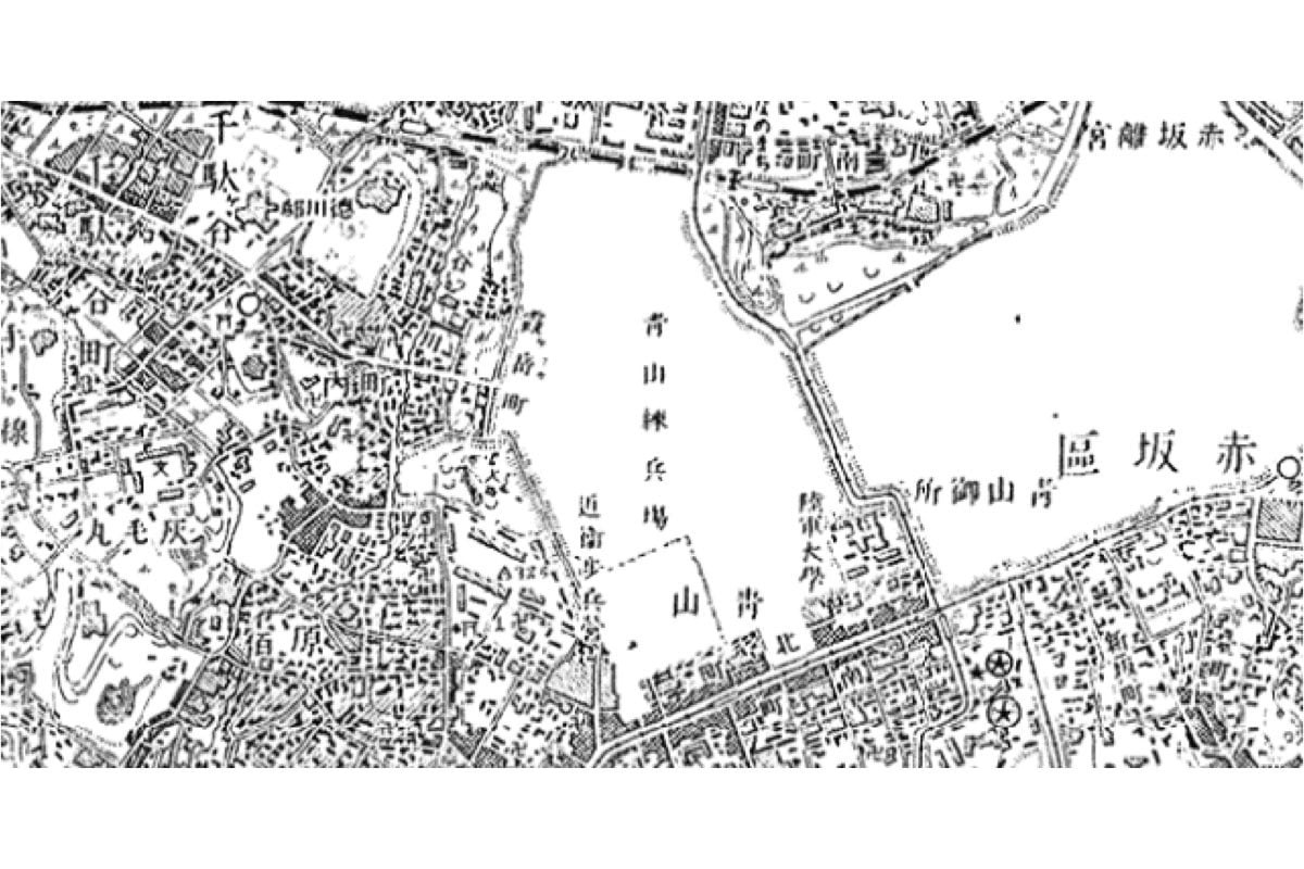 現代の地図と見比べると、練兵場の輪郭が残っていることがよくわかる。ちなみに今に続く青山という地名は、もともとは江戸時代、現在の青山墓地の場所に屋敷を構えていた大名「青山家」がルーツなのだそう。