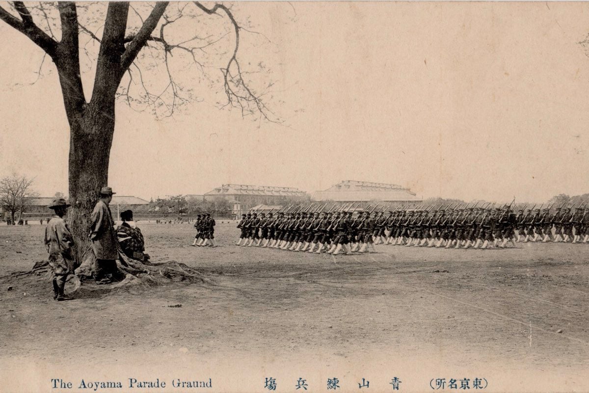 ところで、神宮外苑が整備され銀杏並木が植えられる前の明治時代、この場所には軍人を訓練するための青山練兵場が広がっていた。