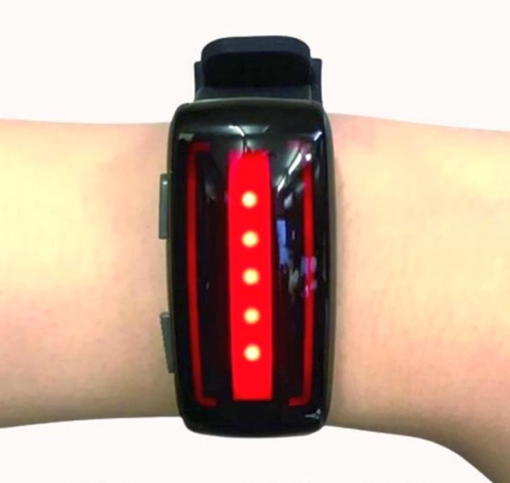 暑熱リスクのレベルが高い順に赤、黄色、緑のLEDと振動で着用者にリスクを知らせる