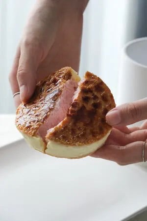 「Leaves」のレアチーズケーキ&しっとりなめらかな特製チーズクリームを、サクサクのブリュレクッキーでサンドしたワンハンドスイーツですよ。