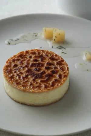 白桃を、ローズマリーなど数種のハーブを合わせた自家製シロップに漬けて、口どけの良いレアチーズケーキと合うソースに。