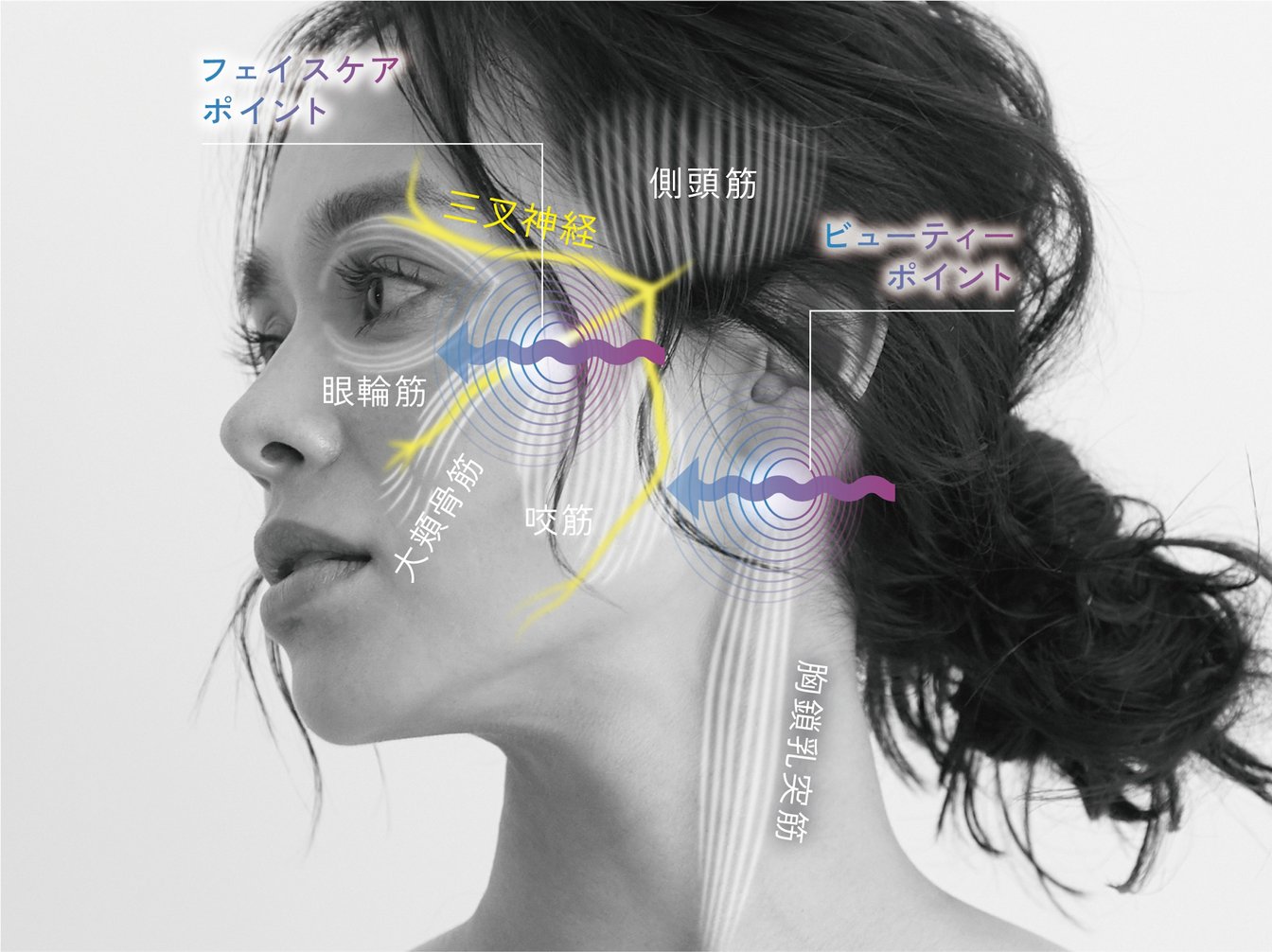 フェイスケアポイントとビューティーポイントに電極ポイントを配置。顔、首の筋肉にアプローチしメンテナンスする(※イメージ)