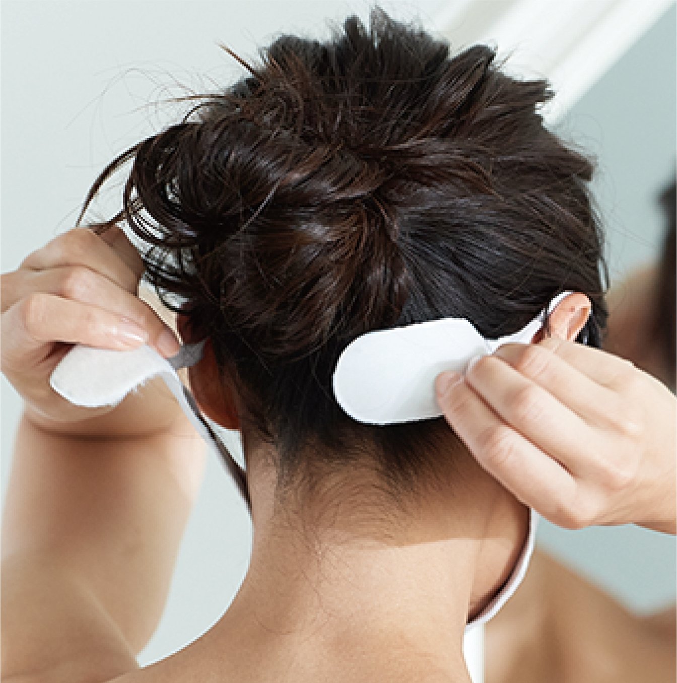 「ルルドスタイル EMS マスクは、ほうれい線の周辺やフェイスライン、首元を包み込んで、気になるポイントを低周波の微弱電流で刺激します。EMSを伝える電極ポイントは左右それぞれ2ヶ所に配置。側頭筋や咬筋などの咀嚼筋群(ソシャクキングン)、首を動かす際に使われる胸鎖乳突筋(キョウサニュウトツキン)、口角を上げるときに使われる大頬骨筋(ダイキョウコツキン)、まぶたの開閉で使われる眼輪筋(ガンリンキン)などにアプローチします」と、ルルドスタイルを展開する株式会社アテックスで商品開発を担当している新子翔也さんは言う。