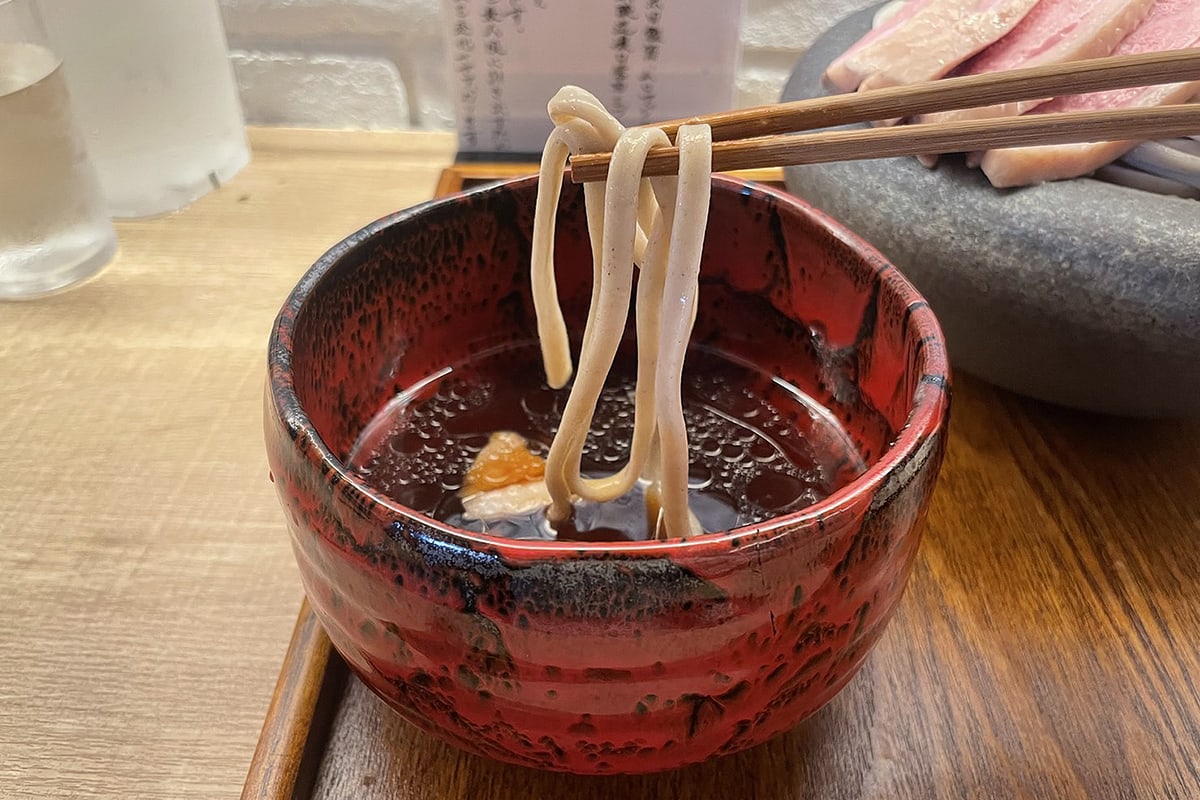 こんなに太いそばは人生初かもしれない。そばつゆにつけて、勢いよくリフト! 出汁の旨みが、太くてもちもちの麺によく染みて最高に美味しい。