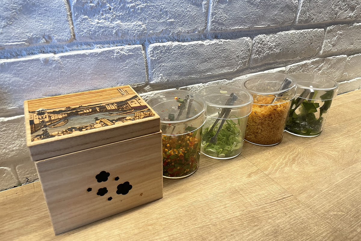 卓上薬味は、海苔、ピリ辛のニラだれ、わかめ、天かす、ねぎと豊富なラインナップ。特に、ニラだれは後半の味変に最適。にんにくがしっかり効いていて、スタミナがつきそう。意外と辛いので、入れ過ぎには気をつけて。