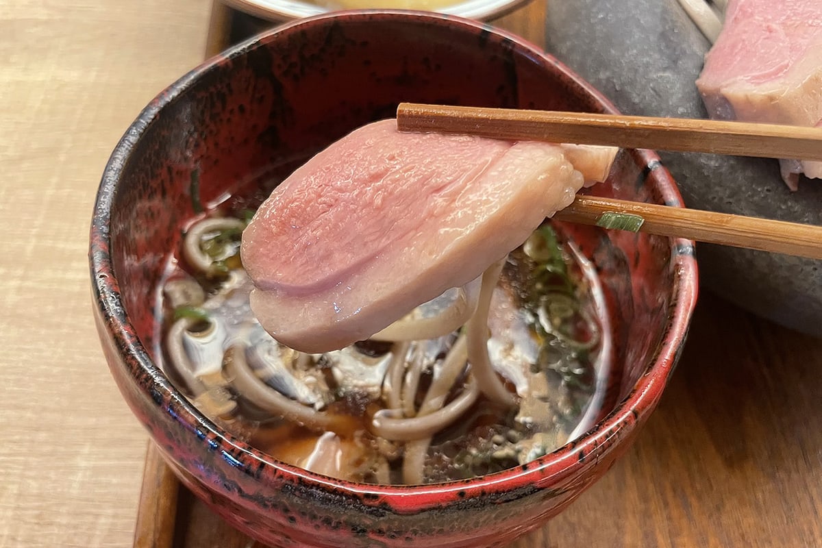 低温調理された鴨も、ちょうどいい塩味でぷりっぷり。これだけでお酒の良いツマミになりそう。そばつゆにもコロコロの鴨が入っており、二種類の食感の鴨を楽しめる。