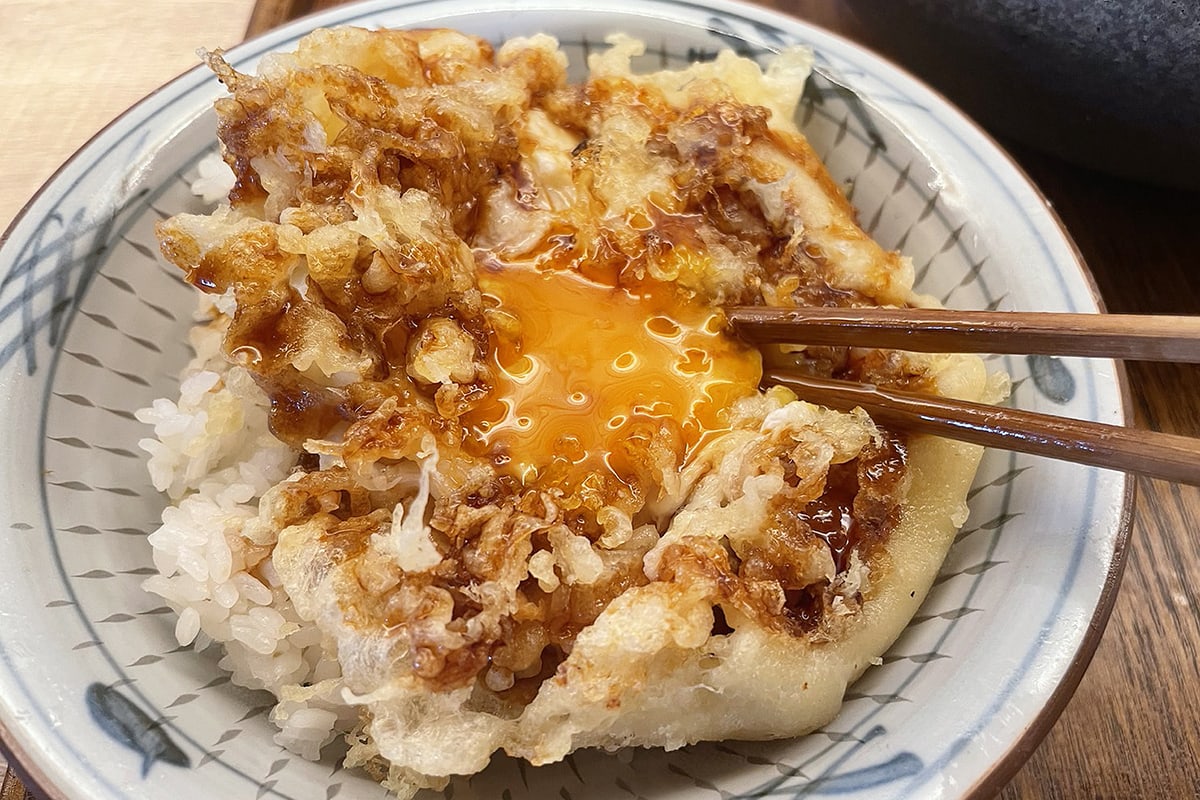 お次は卵天ぷら飯。サクッと箸を入れると、中からトロッと黄味が溶け出していく。甘じょっぱいタレとトロトロの黄味が染み込んだ白米に、サクサクの天ぷら。こんなの、美味しくないわけがない。これで250円は安すぎる!