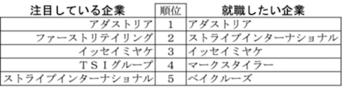 就職したい企業で、アダストリアが1位になったのは初めて。前年の7位からの躍進となった。2位には前年4位だったストライプインターナショナルが、3位には注目している企業と同じくイッセイミヤケが順位を上げて入った。