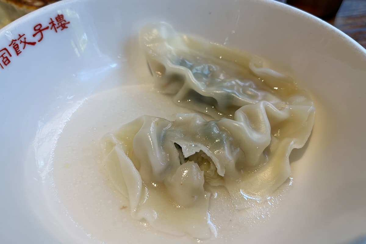 続いて、水餃子をシェアしてもらった。ぷるぷるで、とぅるんとした独特の食感がたまらない。スープと一緒にそのまま食べても美味しいし、もちろんタレを付けてもOK。