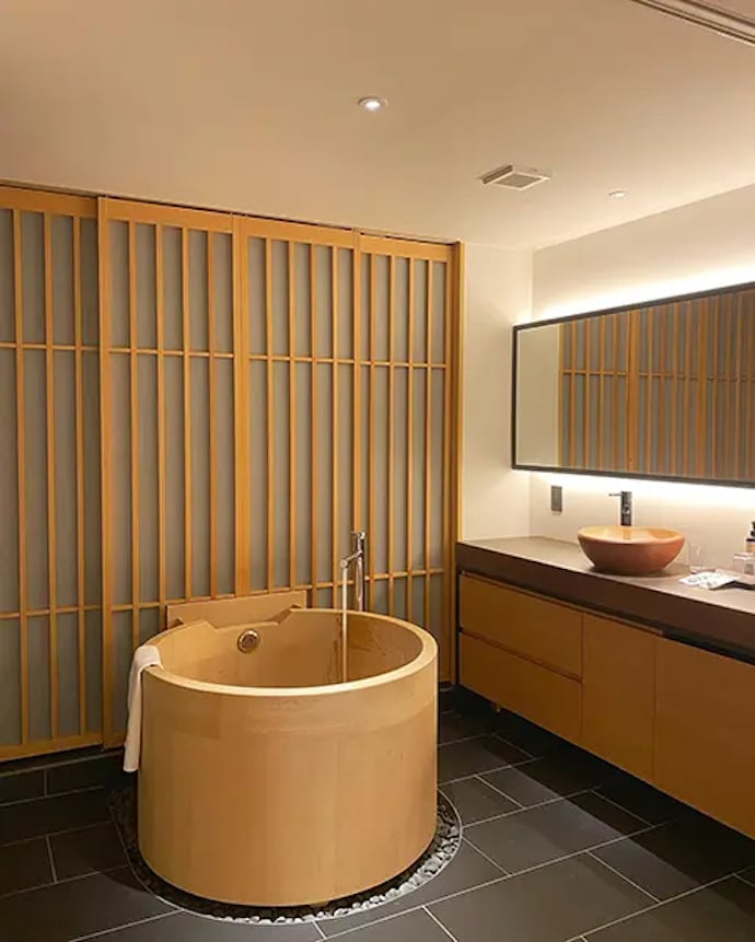 洋室タイプの『Tsuboyu Superior』は、寝室と浴室がワンルームで、インパクトがあるお部屋。他の客室タイプと違って、丸い檜葉の浴槽がとってもかわいらしいんです。