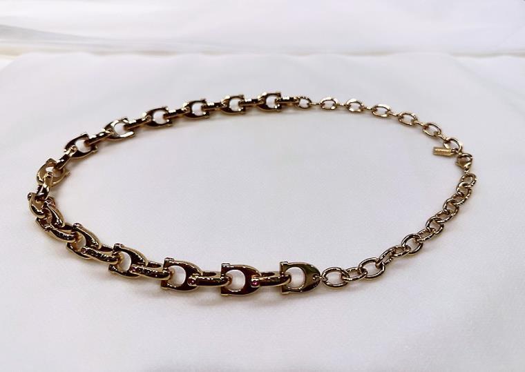 プレゼントに選んだアイコニックなゴールドのチェーンネックレスは、〝C〟のロゴマークとそこにあしらった小さなピンクのストーンが映える上品なデザイン。中間あたりからCが連なってチェーンになっている。試着をした母によく似合っていて、一目ぼれで購入を決めた。浦岡さんは「普段は華奢(きゃしゃ)なネックレスが多いので、新しいデザインのアイテムを贈りたかった」という。母も「自分で買うとしたら選ばないデザイン」と喜び、早速〝1軍〟アクセサリーとして活躍している。