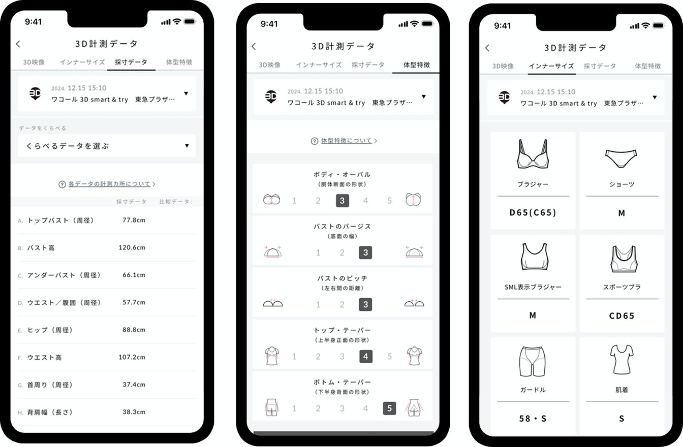 5月には、ワコールが運用する公式アプリ「WACOAL CARNET(ワコールカルネ)」と連動し、3Dボディデータをはじめとする計測データを顧客自身のスマートフォンでいつでもどこでも確認できるとともに、過去の計測データ[1]との比較や体型特徴の解説、おすすめアイテムも見られるようになった[2]。