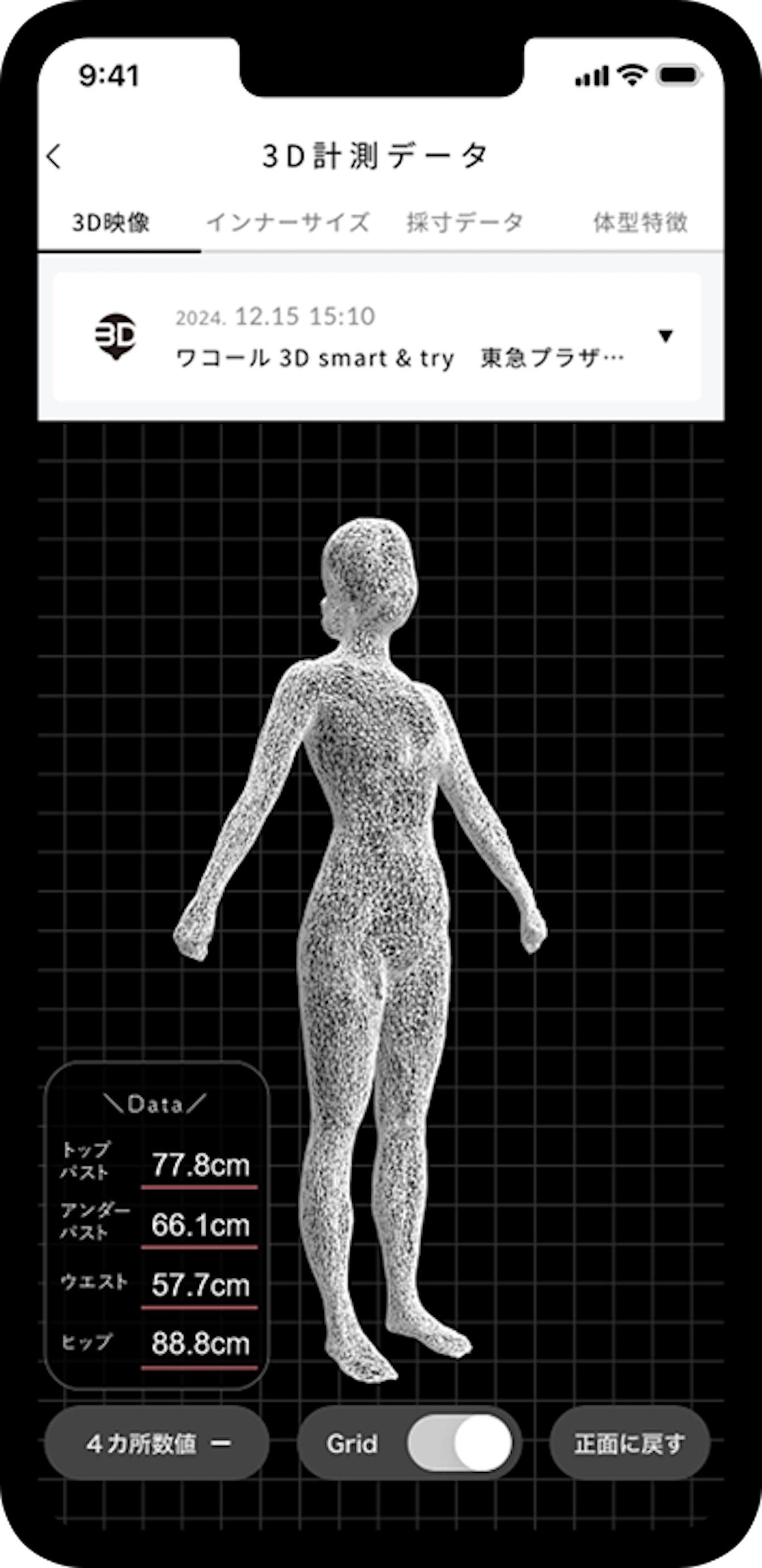 [1]3Dボディデータは過去3回分の保存が可能です。4回目以降は計測日が古いものより閲覧ができなくなります。