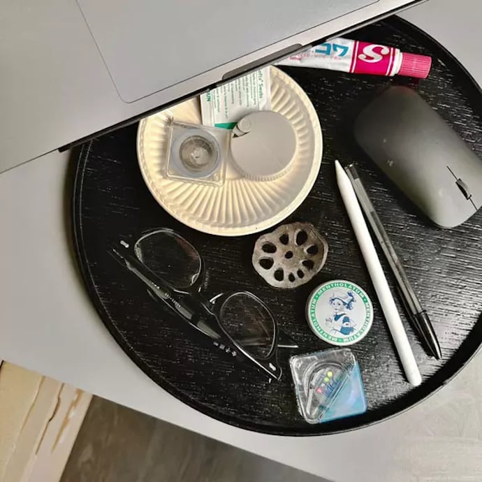 midori:MacBookの台の下に置いている、昨年鎌倉の骨董屋で買ったお盆です。その上には、その時々で私がよく使うものをまとめていて、今はメガネやサブマウス、リップクリーム、ムヒ、メジャーなどを置いています。