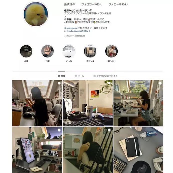 オランダ在住のブランドデザイナー。オランダのアムステルダムにある、カフェのデザインなどを手がけている。また、ポスターブランド「SPACE PAUSE」を姉妹で展開しており、ポスターのデザインを担当。Instagramでは仕事部屋を主に投稿していて、そのセンスフルなお部屋に注目が集まっている。