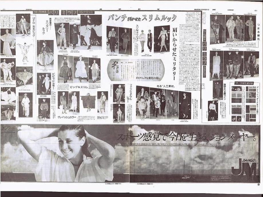 本紙の縮刷版からは、パリ発の速報は原稿のみで、写真の掲載までには数日かかっていることがわかる。その時差を埋めるように、新聞の見開きの2ページを割き、ショーの写真をふんだんに使った特別企画を設けていた。今では定番になった企画の一つだ。伸び盛りのファッションの勢いを伝える写真の中から、紙面に使われなかった様々なショットも見つかった。