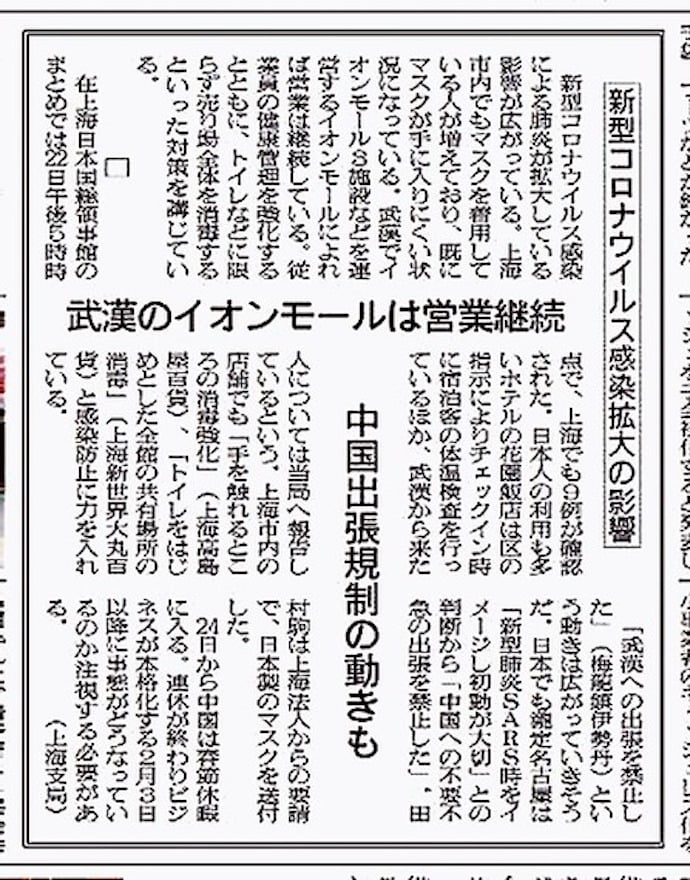 2月に入ると国外移動が可能な間に駐在員を日本へ一時帰国させる動きも出始めた。大手マスコミの日本での報道は有名企業の動きばかり。繊維関連、ましてや中小企業の報道は皆無だった。一時帰国の動きが広がると、記者のところにも同業他社の動きを教えてほしいという問い合わせが日に数件来るようになった。各社に確認して、お答えすると同時に本紙に記事を掲載した。できるだけ多くの人に情報を知ってほしいと思い、ポータルサイト「繊研プラス」にも無料で情報を掲載した。