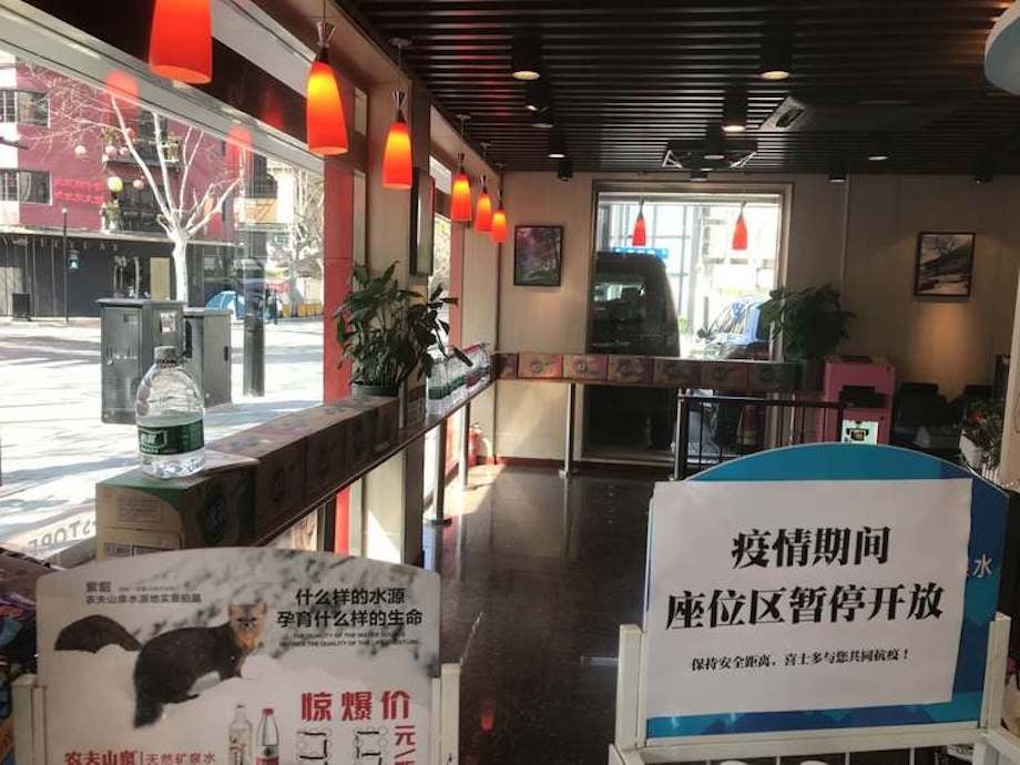 コンビニエンスストアの飲食コーナーも閉鎖された(20年2月)