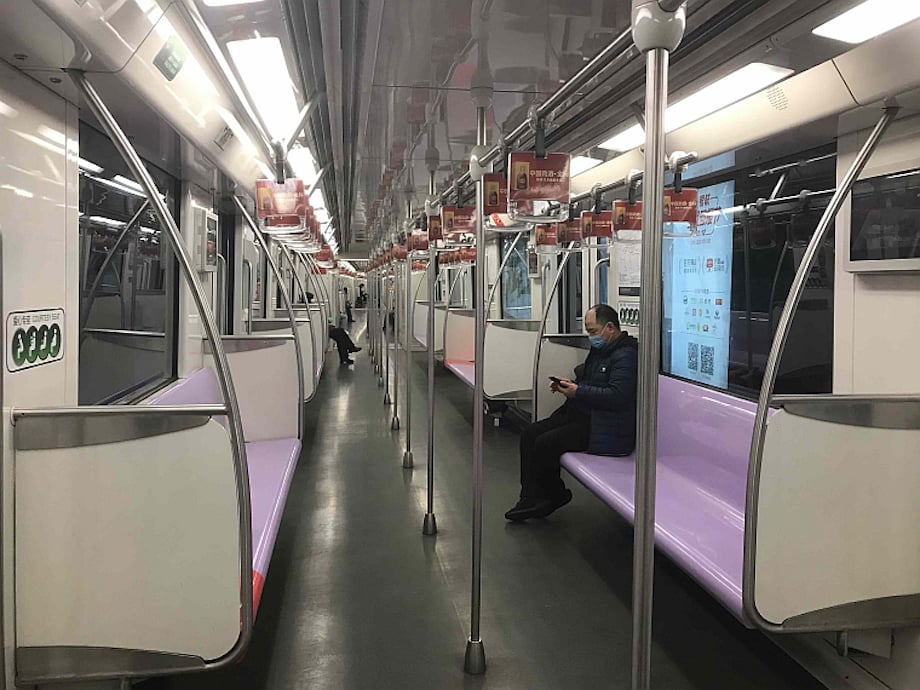 閑散とする上海の地下鉄10号線車内(20年2月)