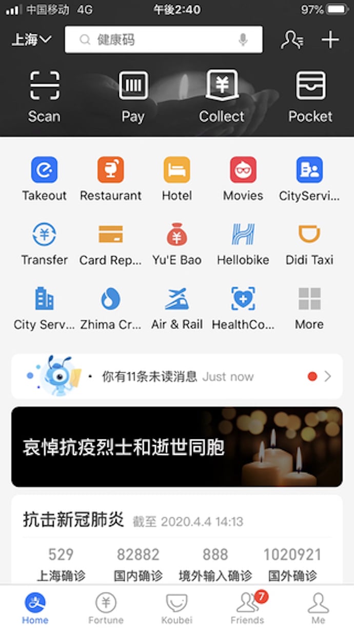 20年4月4日はアプリのトップ画面も黒色に(支付宝)