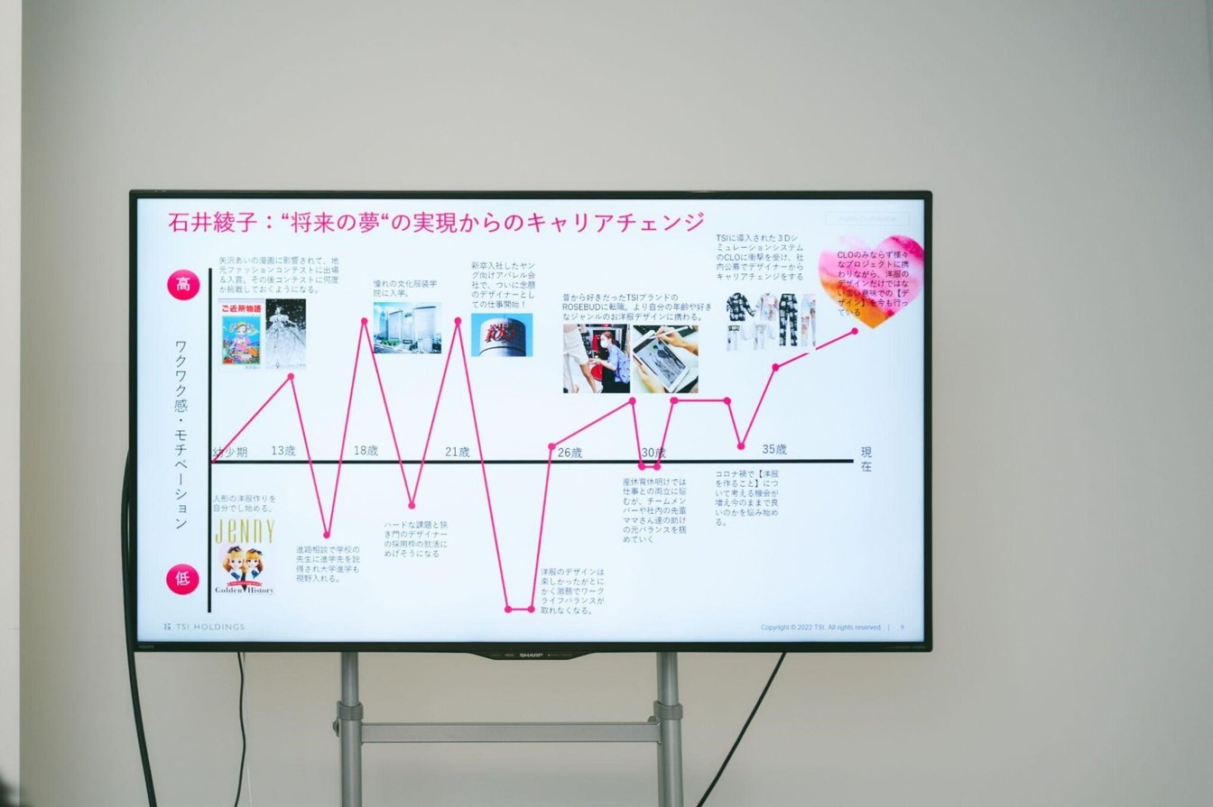 石井さんのモチベーショングラフ。幼少期から夢に描いていたファッションデザイナーというキャリアを武器に、ものを手に入れる行為の先にある体験を提供していく。