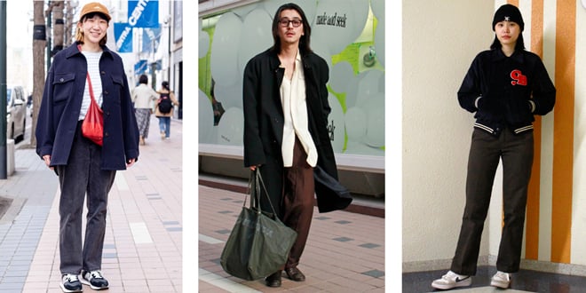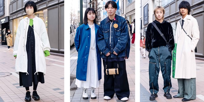 グラウンズのスニーカーを履いていた女性(左)/ミハラヤスヒロのスニーカーとデニムシャツ、シンヤコヅカのパンツを着用していた男性(中)/シンヤコヅカのコートやダイリクのパンツ、タークのパンツなどをそれぞれ着用していた2人組(右)