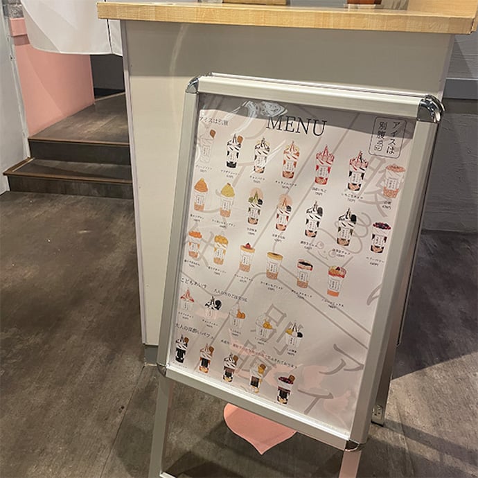 メニューは、通常サイズ(写真右)が全部で20種類(税込550~780円)、通常よりもちょっと小さめのこどもあいす(写真左)が全部で5種類(税込420~460円)あります。