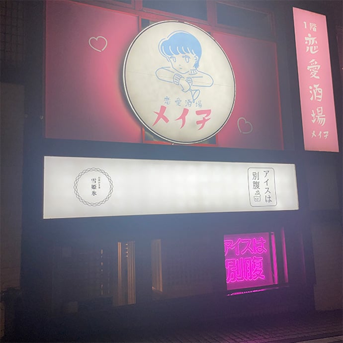 渋谷ヒカリエの横の路地を入っていくと見えてくる「恋愛坂場メイ子」の大きな看板が目印。