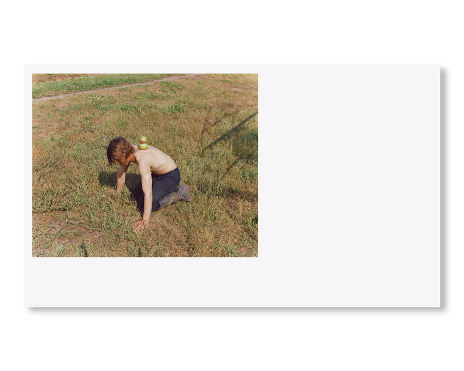 首なし風の人間、茄子の仮面で覆った顔、米袋の上に置かれたままの赤ちゃん、バランスを取りながら背中に大きなトマト2つを乗せ草むらにひざまずく上半身裸の人物など、予想もしていなかったような可笑しさや親しみを感じさせる作品群。