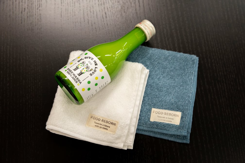 FOOD REBORNが提供している素敵なラベルデザインの100%シークヮーサージュースとパイナップルから抽出した繊維を活用したハンカチ