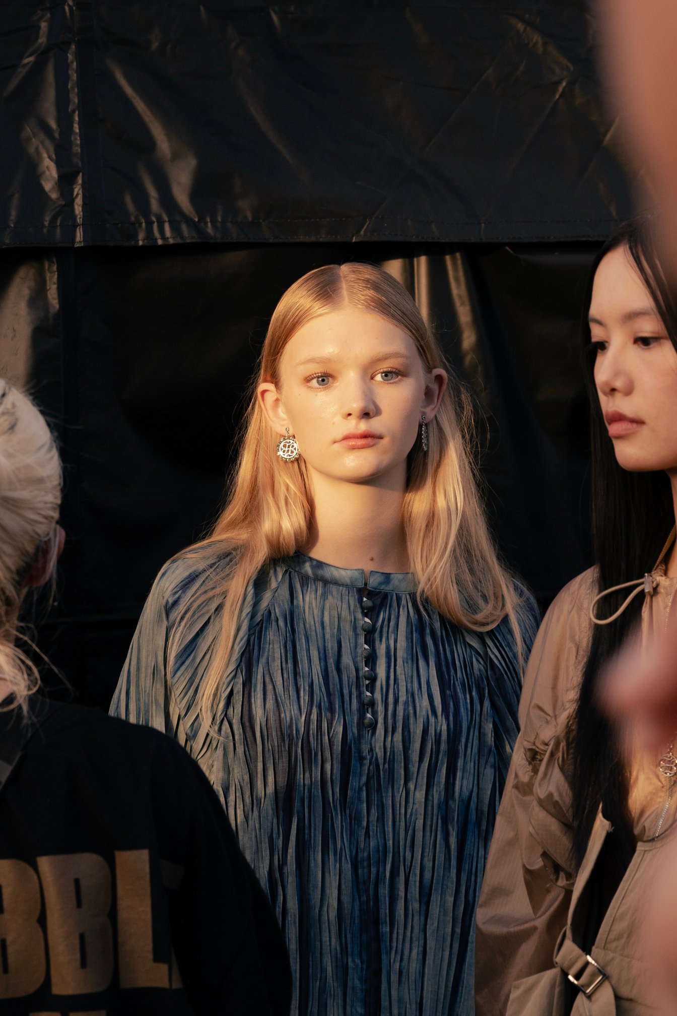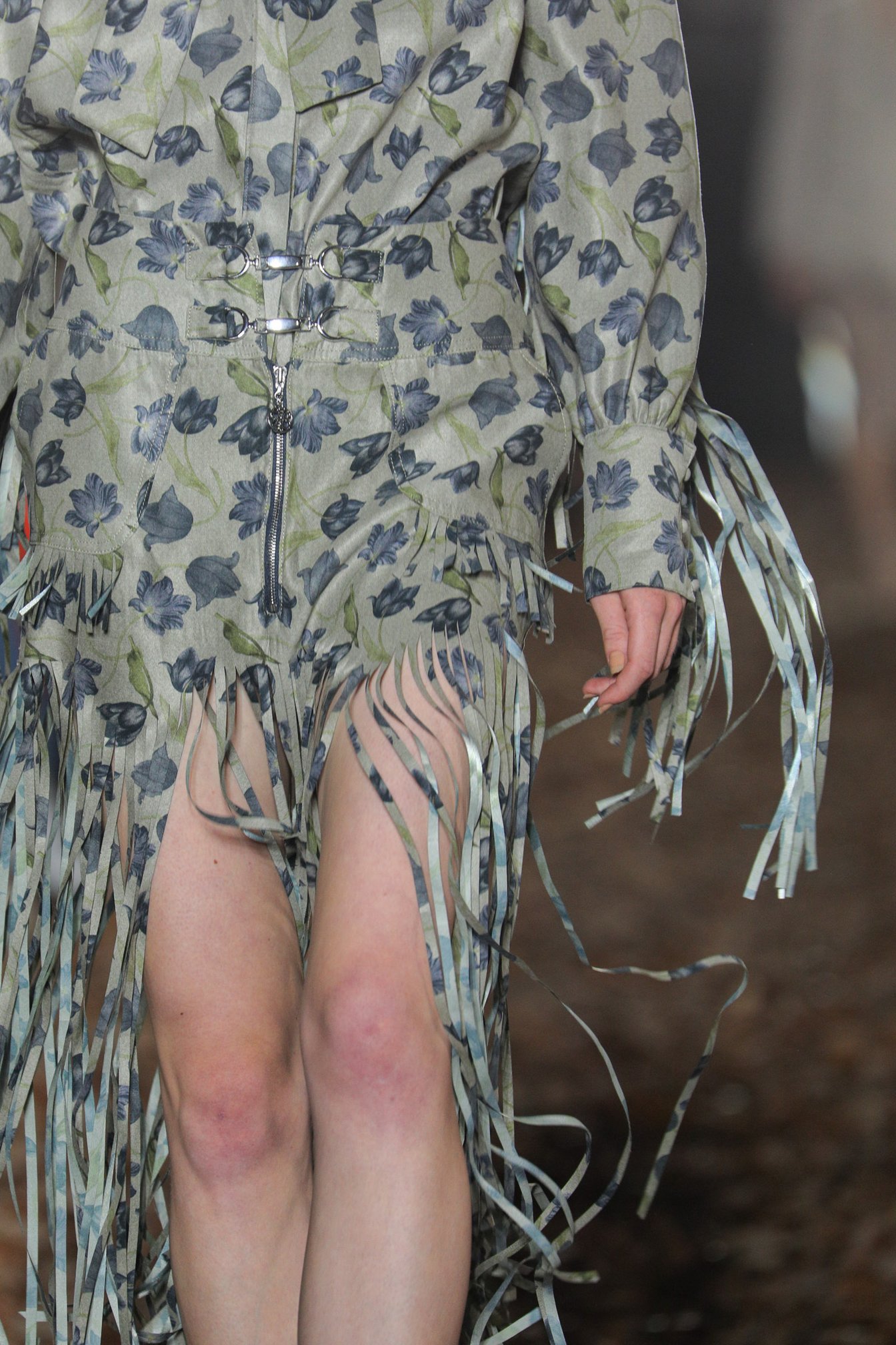 映画の舞台となるアメリカの自然の風景は、雄大で厳しくもあり美しい。その自然のモチーフやイメージを反映させたという会場には、落ち葉が敷き詰められ、暗転した世界に力強い夕焼けのようなライトが差し込みショーがスタートした。フリンジがあしらわれたウエスタンシャツや馬柄のテキスタイルのワンピース、デニムアイテムなど、ヒッピーやフラワームーブメントといったアメリカで自由と平和の精神のもと培われたカルチャーやファッションスタイルからの引用も多く見られた。