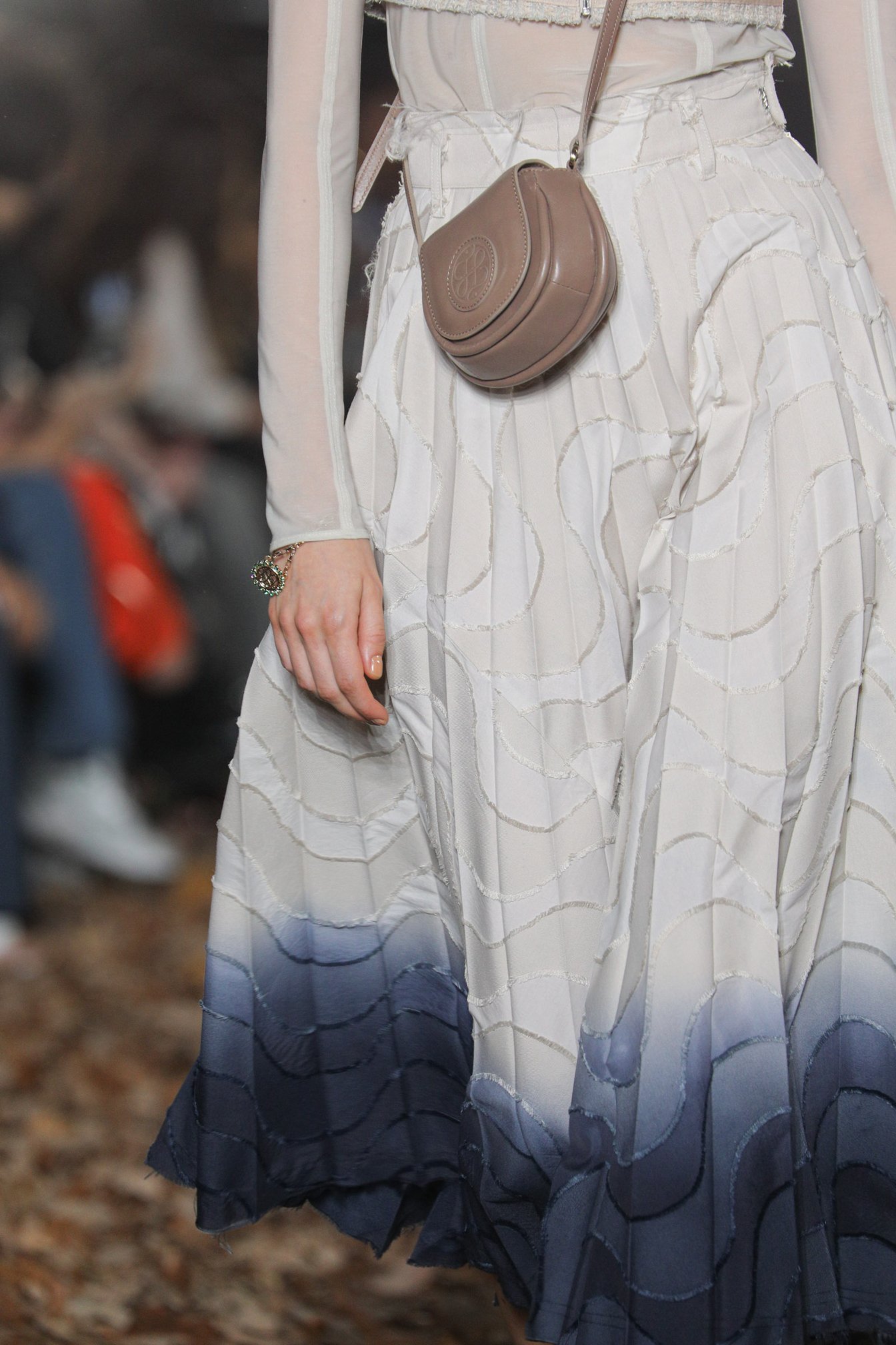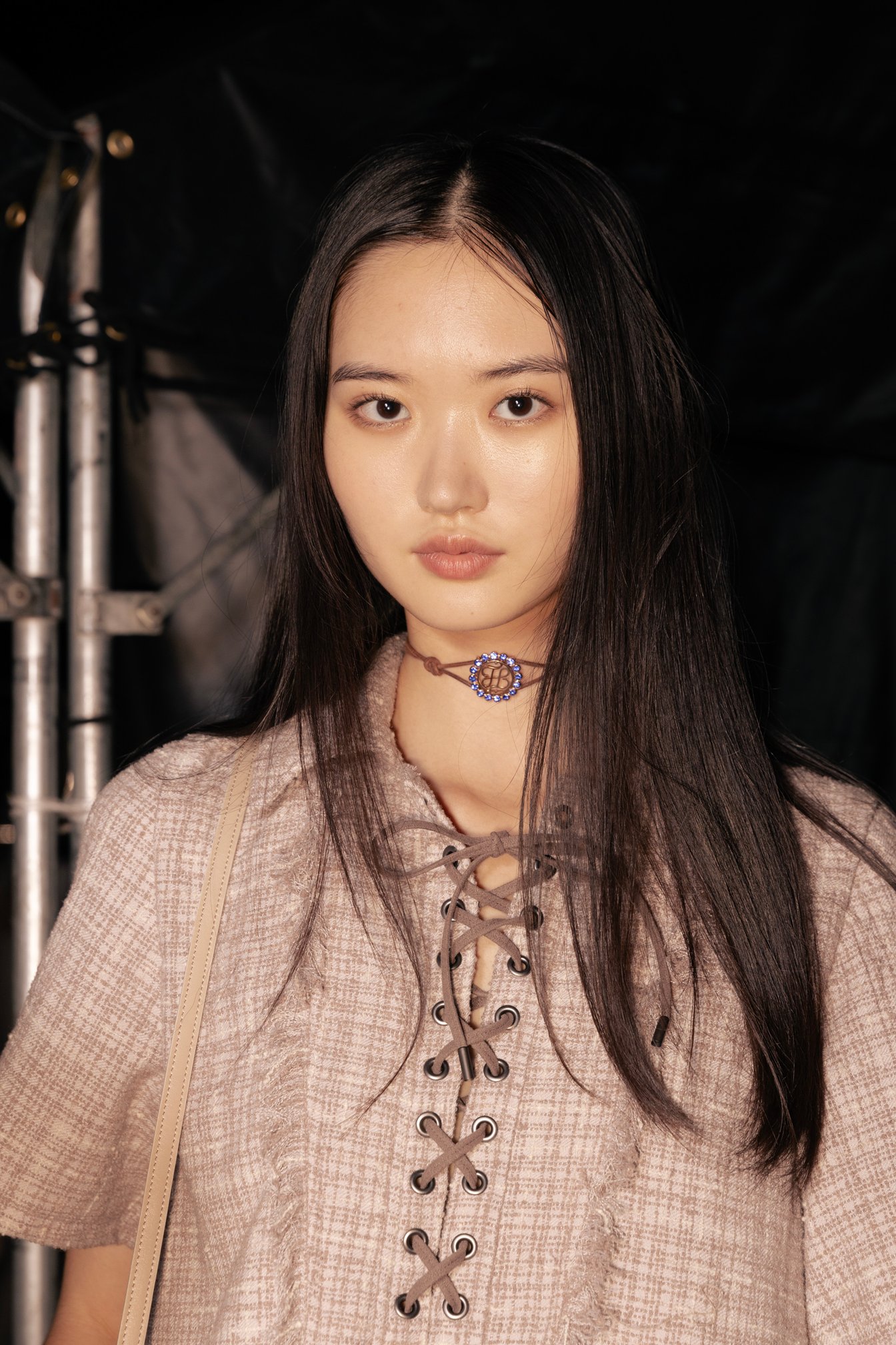 今回初めて発表したアクセサリーアイテムは、ビジューパーツにレザーのストラップをあしらったチョーカー、チェーンベルトがついたブレスレット、ピアスと、艶と丸みのあるレザーのショルダーバッグの4型。カントリーな雰囲気の中に差し込まれるビジューの煌めきがモダンな印象を加えた。