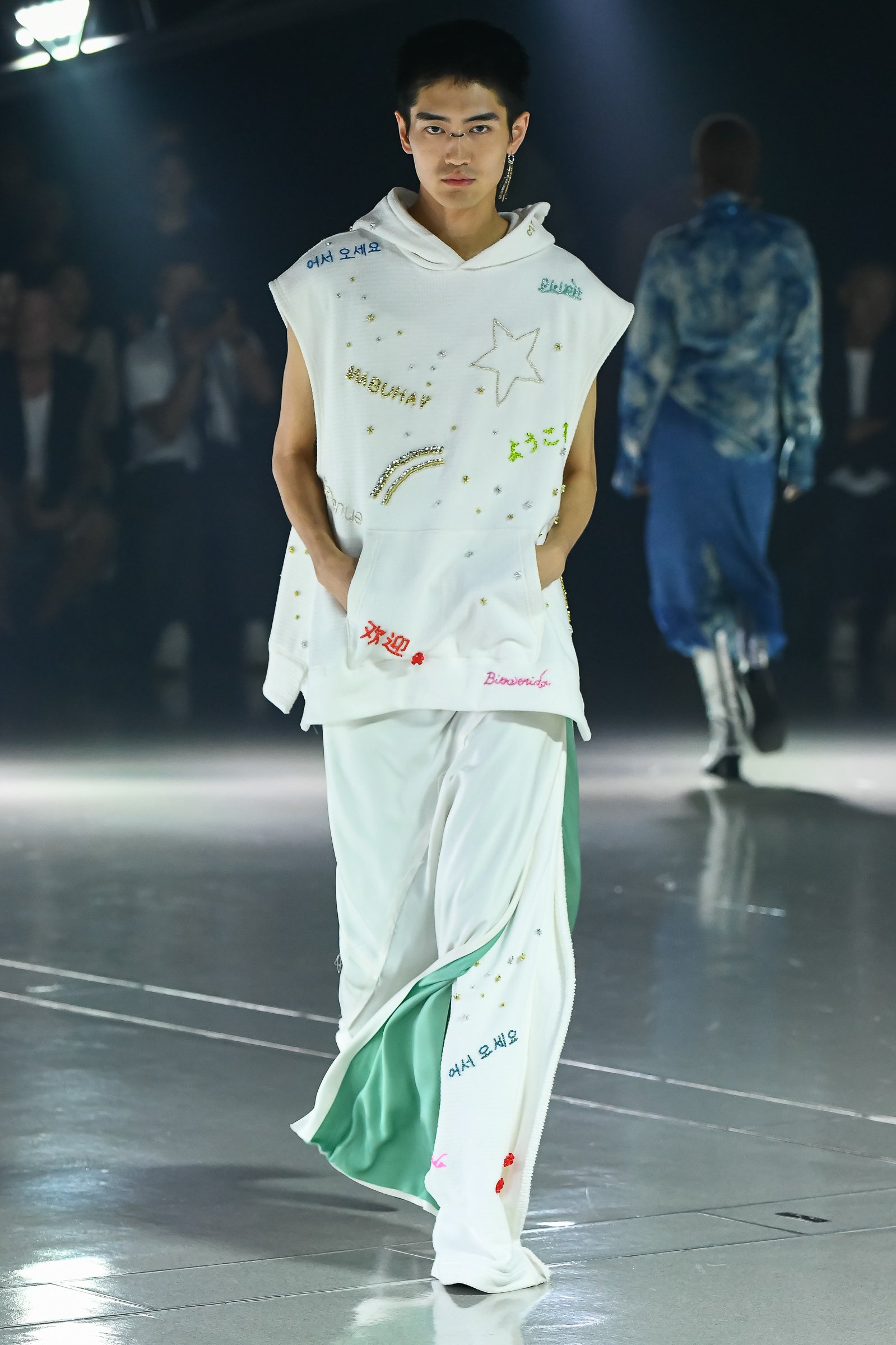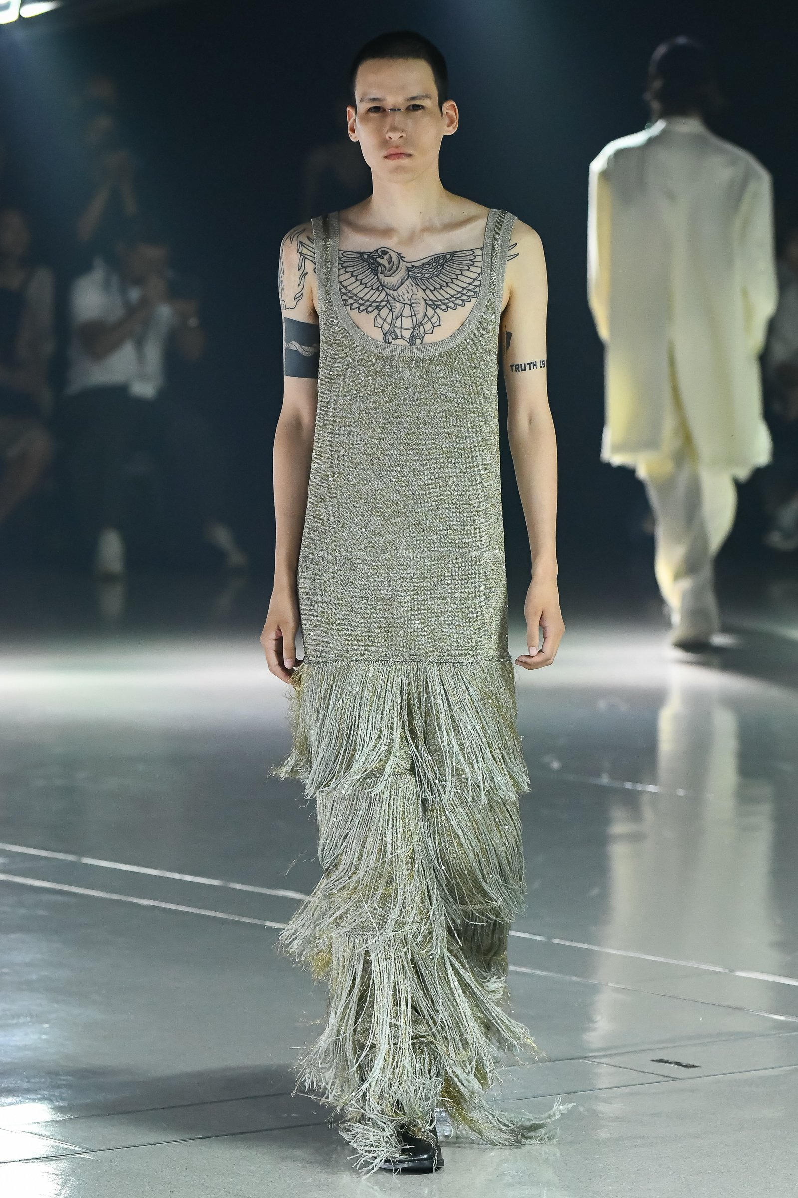 まずは今シーズン「JFW ネクスト ブランド アワード(JFW NEXT BRAND AWARD)」で受賞を果たし、ブランド初のコレクションショーを行なった「カナコ サカイ(KANAKO SAKAI)」これまでのルックや経歴を見るとレディースブランドであることがわかるが、ショーではモデルの半分が男性を起用。特にタトゥーの入ったモデルが煌びやかな素材でフリンジの効いたワンピースを着ている珍しい組み合わせに魅力を感じた。男性モデルが露出の多いドレスを着ることで「アイテムに男女の境界はない」というデザイナーの意図を受け取れる。しかし現在、社会でジェンダー論が議論される中でも特にトランスジェンダーが差別される事件が起きている。「ファッションは自由であり男女はない」と我々はアプローチするものの、現実は追いついていないのが現状である。