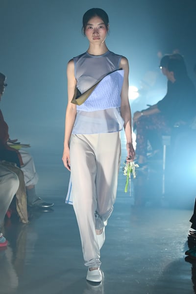 軽い素材をあまり使用したことがなく春夏シーズンが苦手だったという譚だが、2024年春夏コレクションでは軽い布帛を造形的に構築。透け感のあるチェックのワンピースなどクリーンな印象のなかに歪みをやねじれを加えたルックを多く揃えた。一輪挿しが付けられたアルミの板のバッグは、アルミ工場の既製品の円盤に、花を挿すことができるオリジナルのメタルパーツを装着。持ち歩くだけでなく、インテリアとして飾っても美しいデザインに仕上げた。夢心地のような雰囲気のショーの中で、花を持って歩くためだけに作られたバッグは、異国の地で孤独を感じる人間に寄り添ってくれる救いのようにも、ふと散歩中に見つけて摘んだ花のような軽快なアイテムのようにも見える。