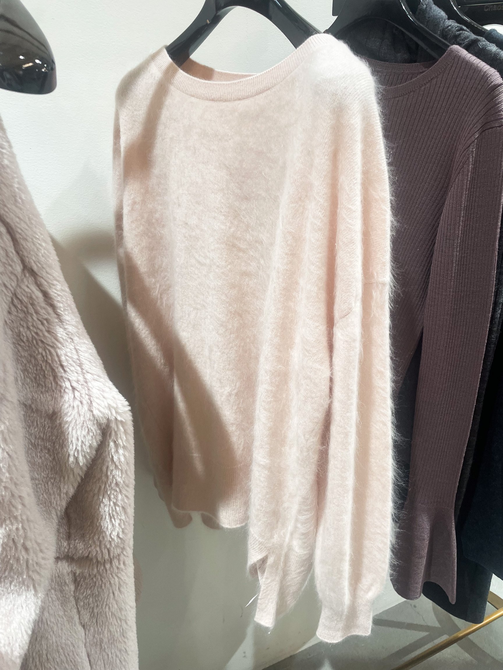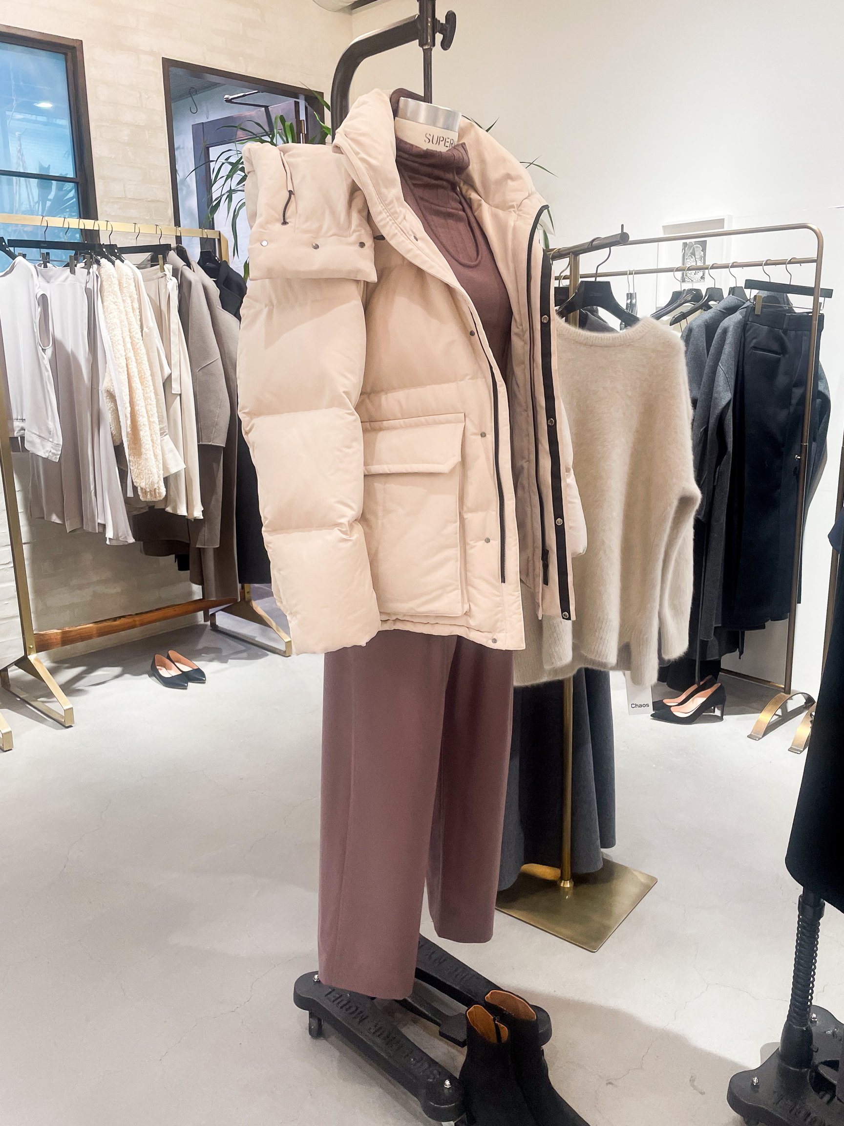 リニューアルの店舗では、好評価だというオリジナル商品の2023年秋冬コレクションを販売。今シーズンは、素材の品質を追求するカオスらしく、リャマの素材を使ったコート、ニット、ストールの3アイテムが登場するほか、850フィルパワーのオリジナルダウンや、毎シーズンの定番のオリジナル素材「スーペリア」生地からロング丈のコートなどをラインナップ。軽衣料やパンツ類も強化している。
