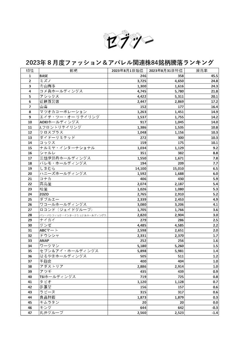 「セブツー」では、ファッション&アパレル関連84銘柄の月間株価騰落率を毎月調査してそのランキングを作成している。今回は8月1日始値と8月31日終値を比較したランキングを発表する。
